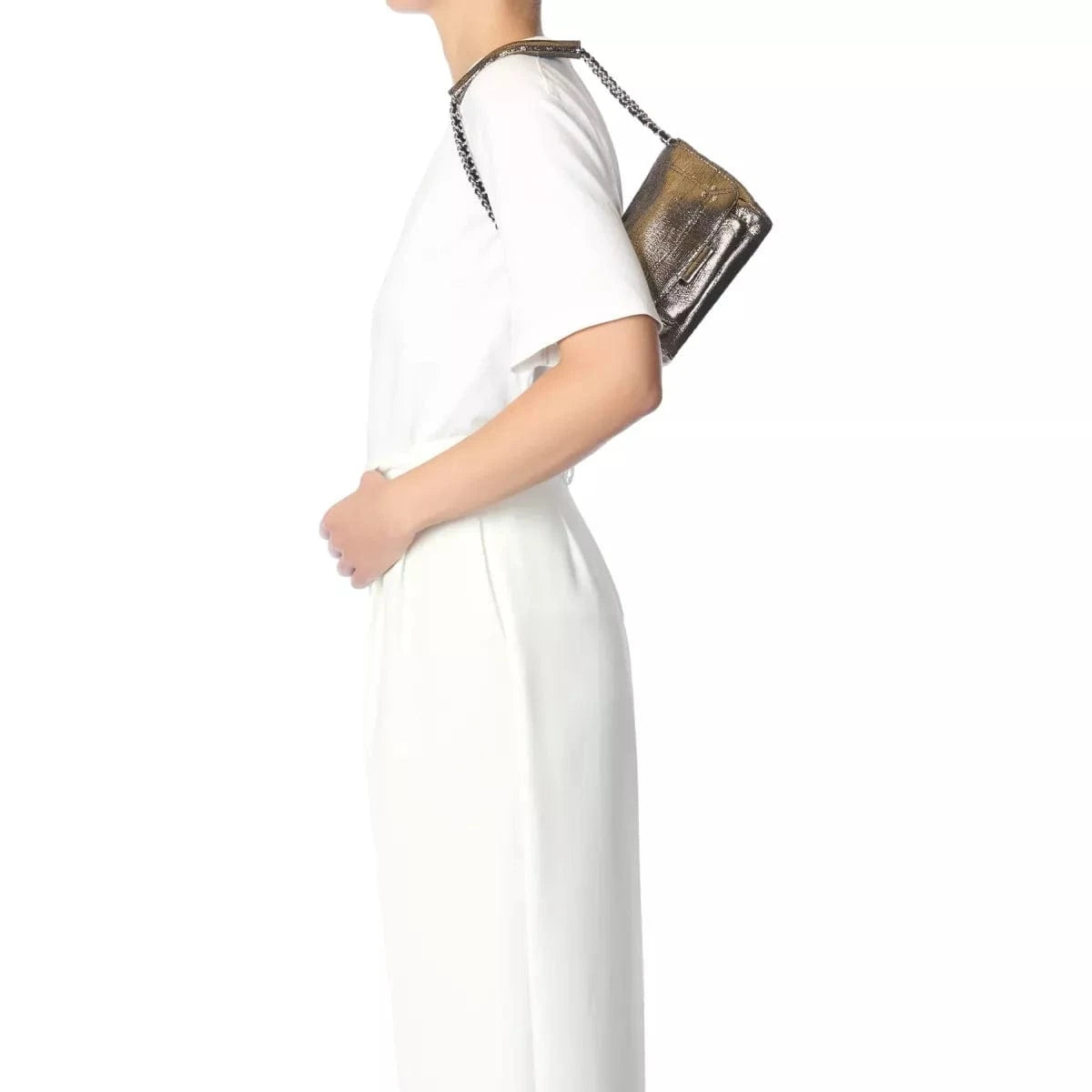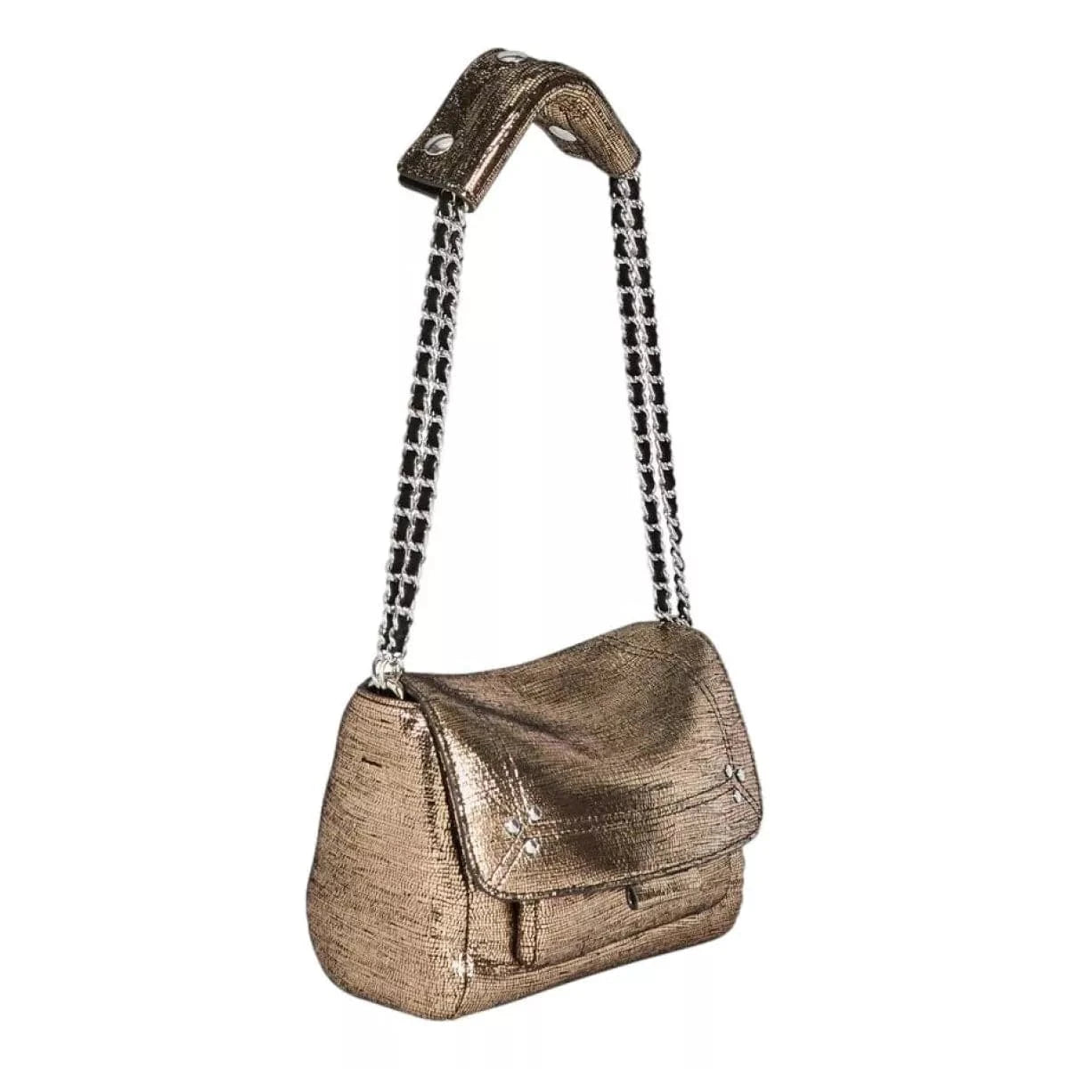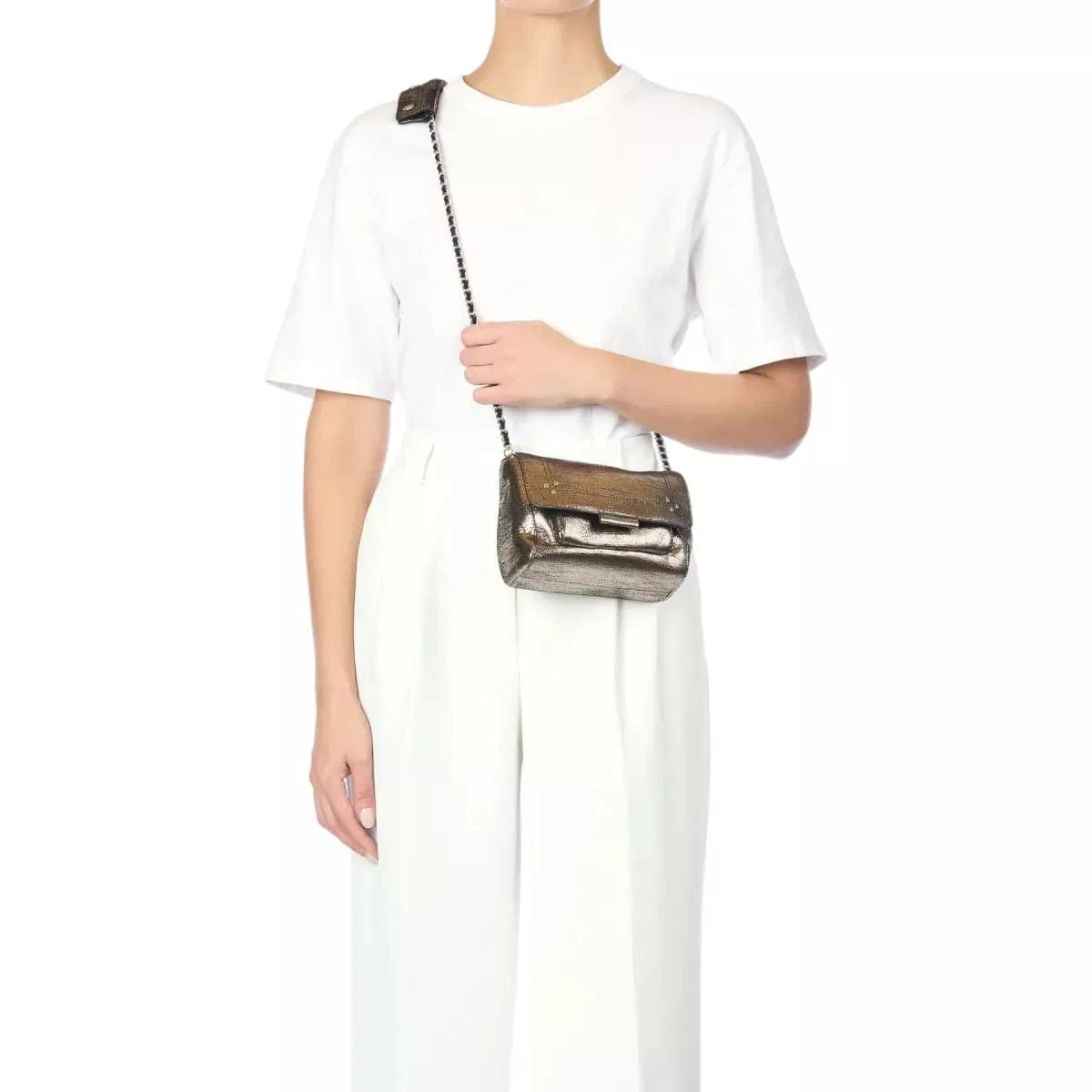 Een afneembare en verstelbare ketting en leren schouderband in twee lengtes; van maximaal 105 cm en een kortste afmeting van 52,5 cm met groot leren schouderstuk met drukknopen. Klep met magnetische sluiting. Georganiseerde tas met een groot compartiment en een binnenzak. Onder de klep een klein vakje. Een sleutelhanger-schakel in de tas.