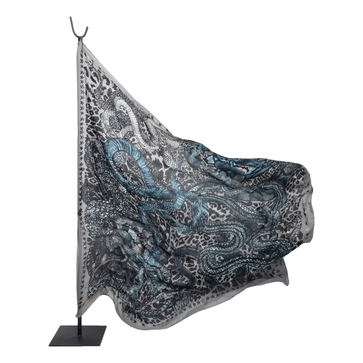 De Billie Snakes sjaal is een opvallend accessoire met een edgy print en luxueuze feel. Gemaakt van een zijdeblend met een slangenprint, voegt deze vierkante sjaal moeiteloos karakter toe aan elke look — of je hem nu draagt rond je nek, in je haar of aan een tas geknoopt.