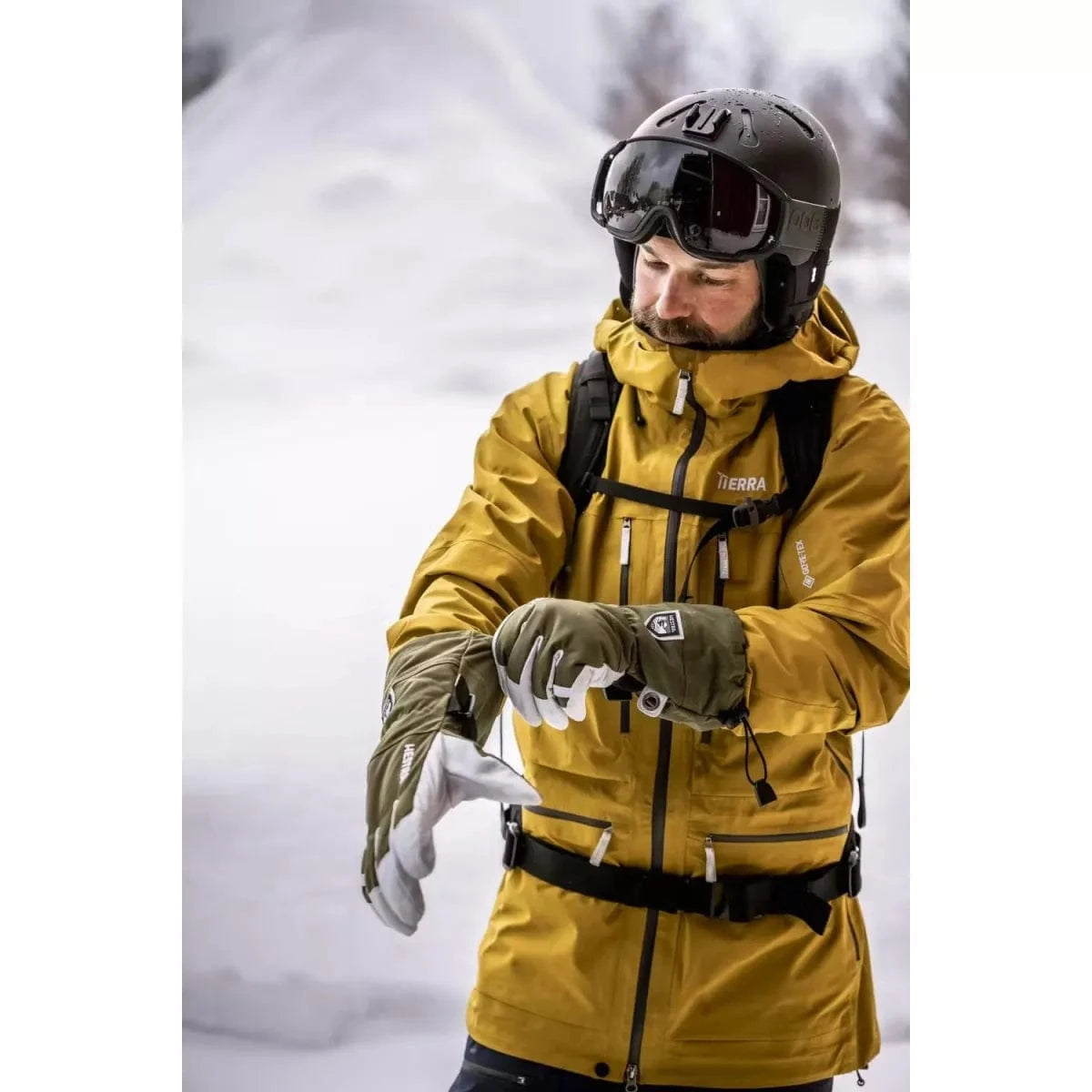 De Hestra Army Leather Heli 5-finger Skihandschoen is oorspronkelijk ontwikkeld voor skigidsen in het westen van Canada die een betrouwbare en warme skihandschoen nodig hadden voor lange dagen in de sneeuw en kou. Gemaakt van duurzaam geitenleer dat uitzonderlijke grip en gevoel biedt, en een waterdichte, 3-laags polyamide stof op de rug van de hand. Deze HESTRA Army Leather Heli 5-finger Skihanschoenen in army hebben een reeks slimme functies die goed van pas komen wanneer je niet zo vaak naar binnen kunt gaan om op te warmen. De voering kan bijvoorbeeld eenvoudig worden vervangen als deze vochtig wordt of om aan te passen aan wisselende activiteitsniveaus en temperaturen. En de lange manchet heeft een sneeuwslot dat, samen met een klittenband op de pols, ervoor zorgt dat de warmte in de handschoen blijft. Een polsband vermindert de kans op het laten vallen van de handschoen als je deze afdoet om de telefoon te beantwoorden of je uitrusting aan te passen. Een meegeleverde karabijnhaak en een oogje aan de pink maken het mogelijk om de handschoen met de opening naar beneden aan je skibroek of klimharnas te hangen - praktisch om te voorkomen dat het gevuld wordt met sneeuw terwijl je werkt met alleen een dunne voering aan je handen. Een duurzame, flexibele metgezel voor skiërs die veel tijd buitenshuis doorbrengen en zich vaak ver van het skigebied en zijn comfort bevinden. Ook verkrijgbaar als want en 3-vinger model.