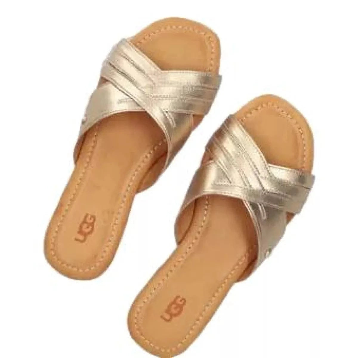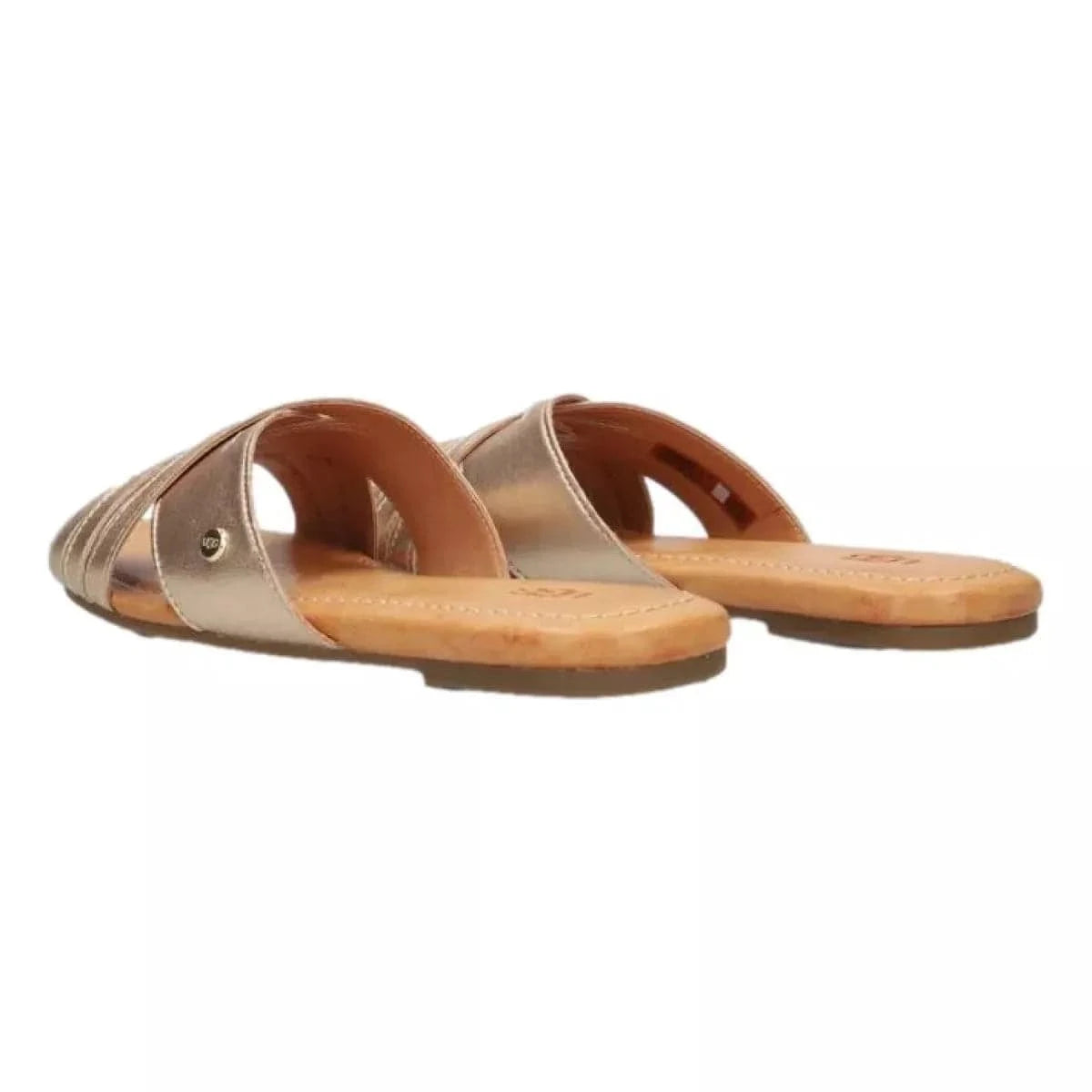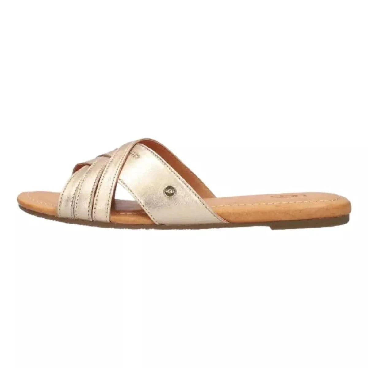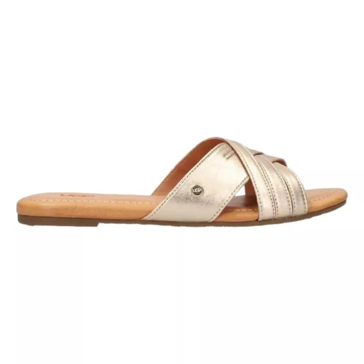 Deze stijlvolle slipper van UGG is perfect voor een comfortabele en trendy look. De slipper heeft twee gekruiste banden over de wreef die zijn gemaakt van zacht goudkleurig leer. De binnenkant is ook van leer gevoerd voor extra comfort. Het voetbed is iets verhoogd voor een betere loophouding en de rubberen zool heeft een grof profiel voor stevige grip.