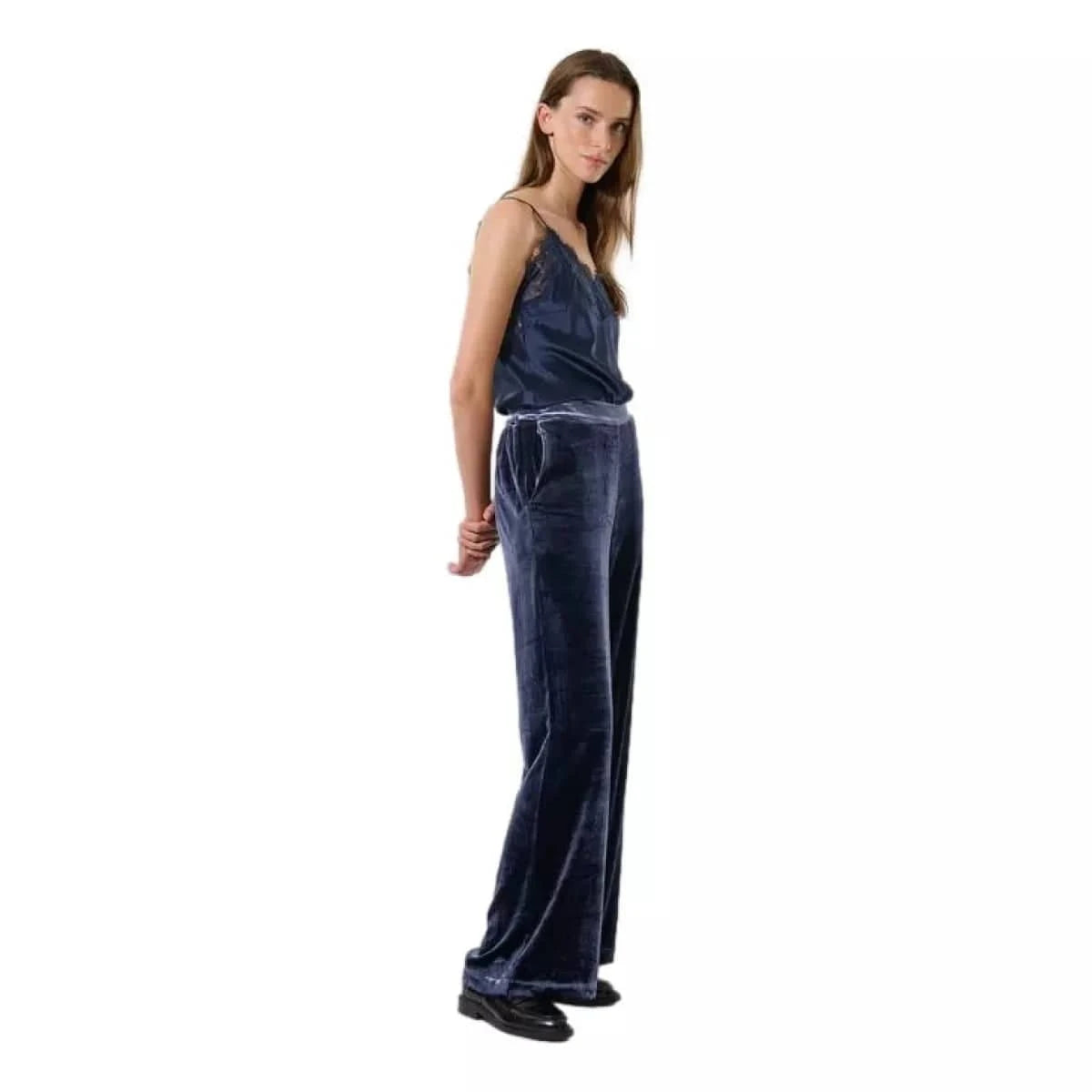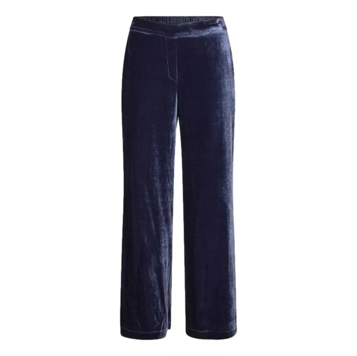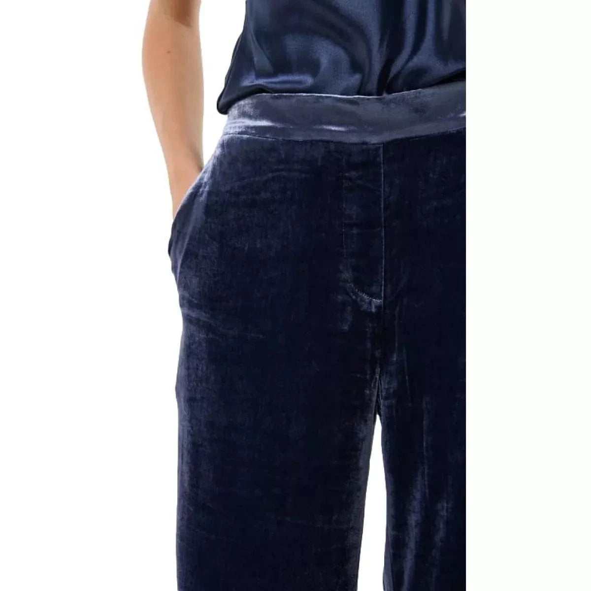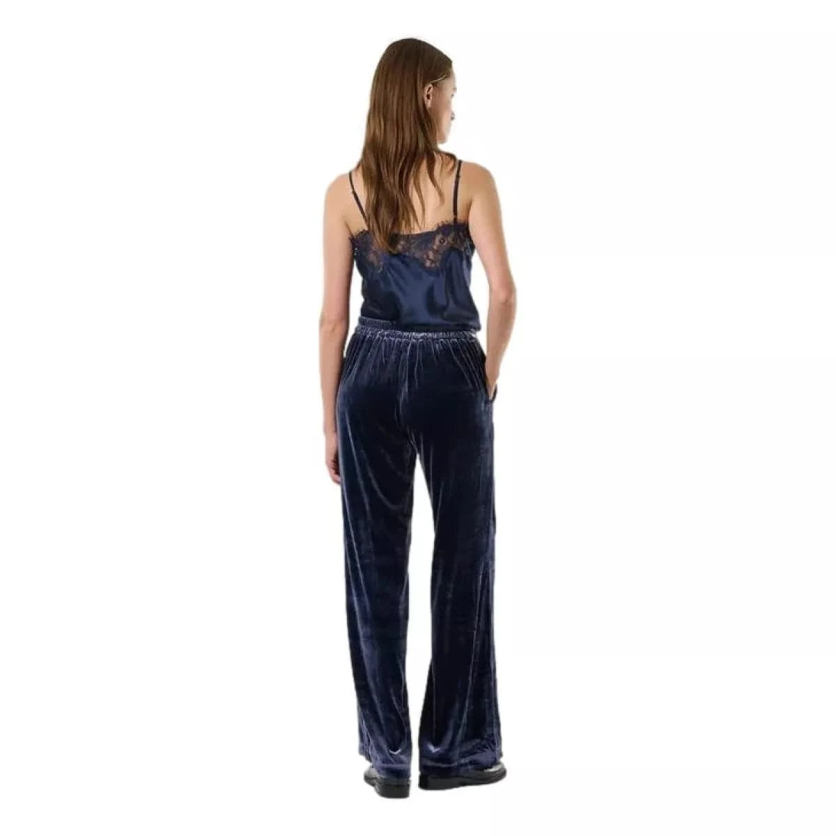 Deze moeiteloos chique pyjamabroek in luxueuze middernachtblauwe viscose en zijdefluweel is zowel verfijnd als relaxed. Met een relaxte pasvorm, wijde pijpen en elastische tailleband vallen ze prachtig wanneer ze worden gedragen met het bijpassende jasje of met een eenvoudig topje.
