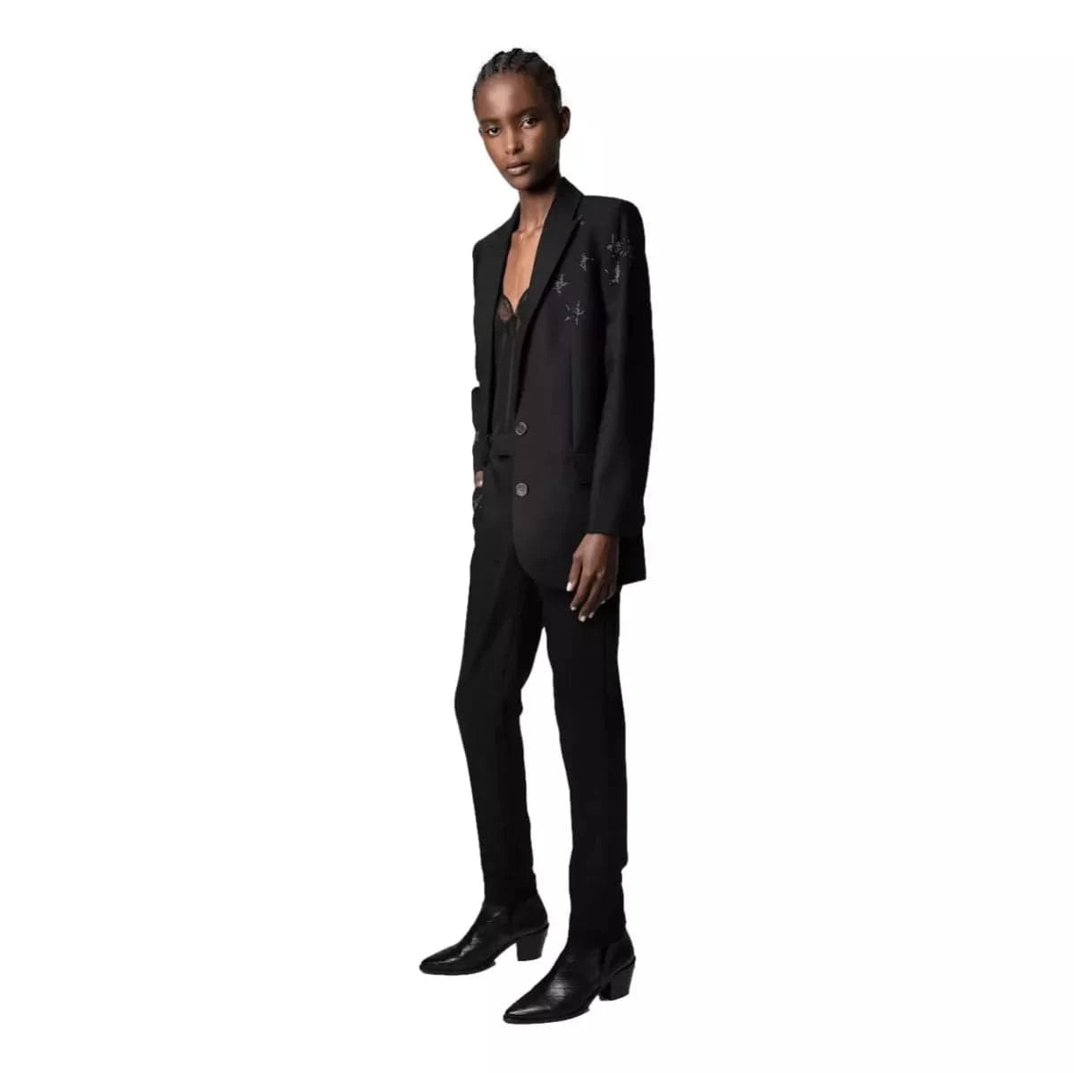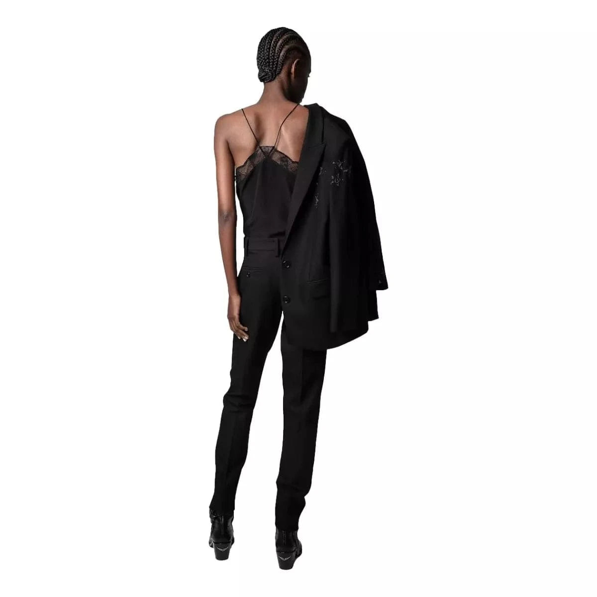 De Zadig et Voltaire Prune Strass broek in zwart belichaamt hedendaagse elegantie met een vleugje rock-'n-roll chic. Deze broek is versierd met subtiele strass-details die een moderne twist geven aan het klassieke ontwerp. Gemaakt van hoogwaardig materiaal met een comfortabele pasvorm, perfect voor het toevoegen van een edgy flair aan je outfit.