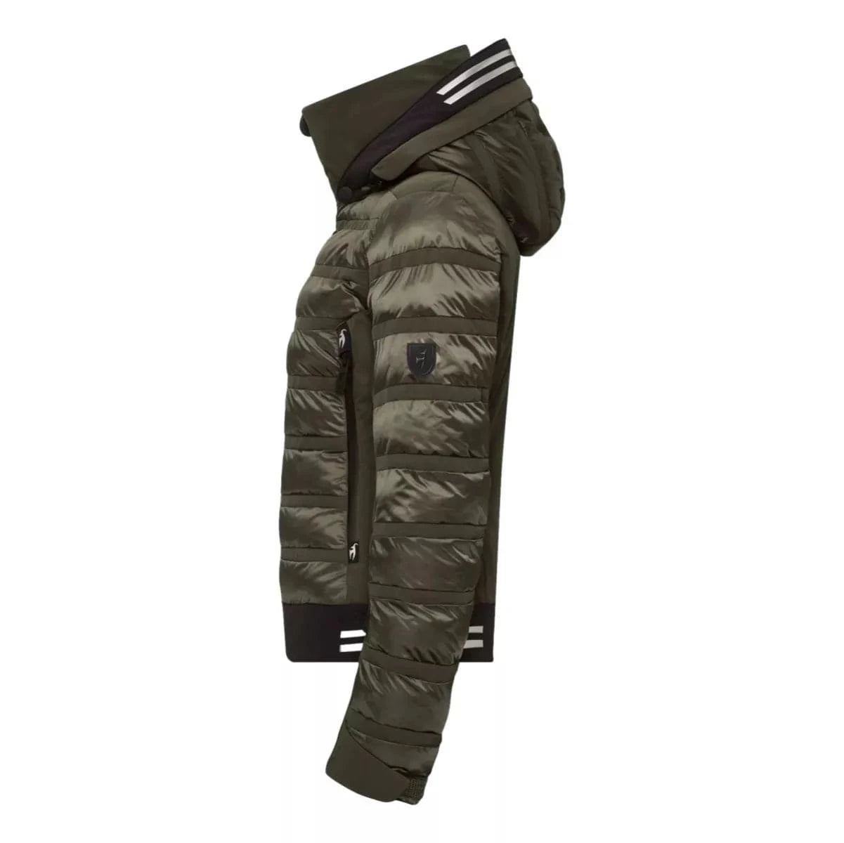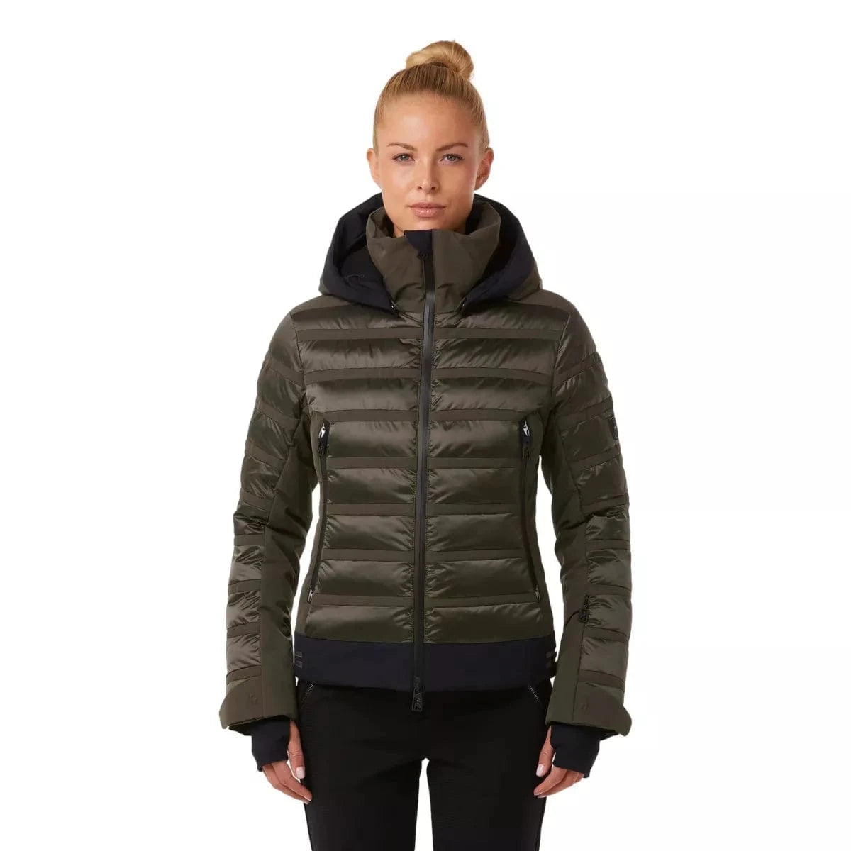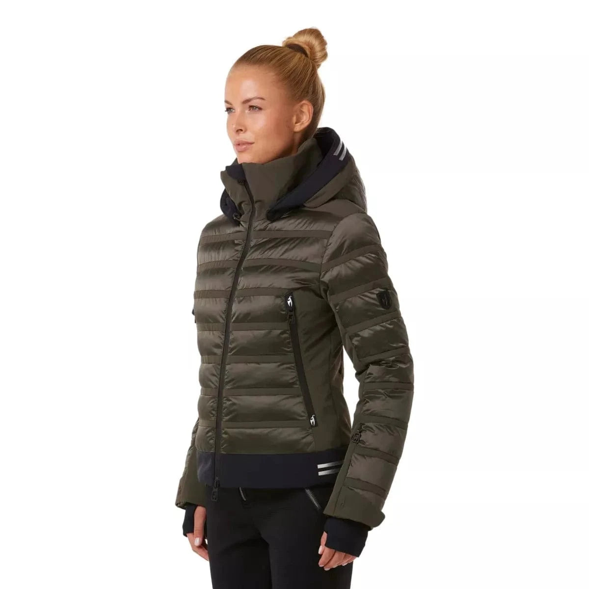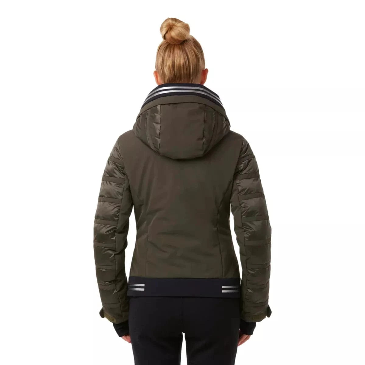 De RUBIE SPLENDID damesski-jas wordt gekenmerkt door een bijzonder stijlvolle materiaalmix: glanzend parelmoer nylon gecombineerd met Japanse premium 4-way stretch. Uitgerust met een krachtig PU-membraan krijgen kou, wind en water geen kans om binnen te dringen. Ook de gebruikte YKK AquaGuard®-rits en een waterafstotende afwerking dragen hieraan bij. De visuele details van het ski-jack zijn de contrasterende lasergesneden strepen op de capuchon en zoom en de Toni Sailer-zeem op de ritsgarages.