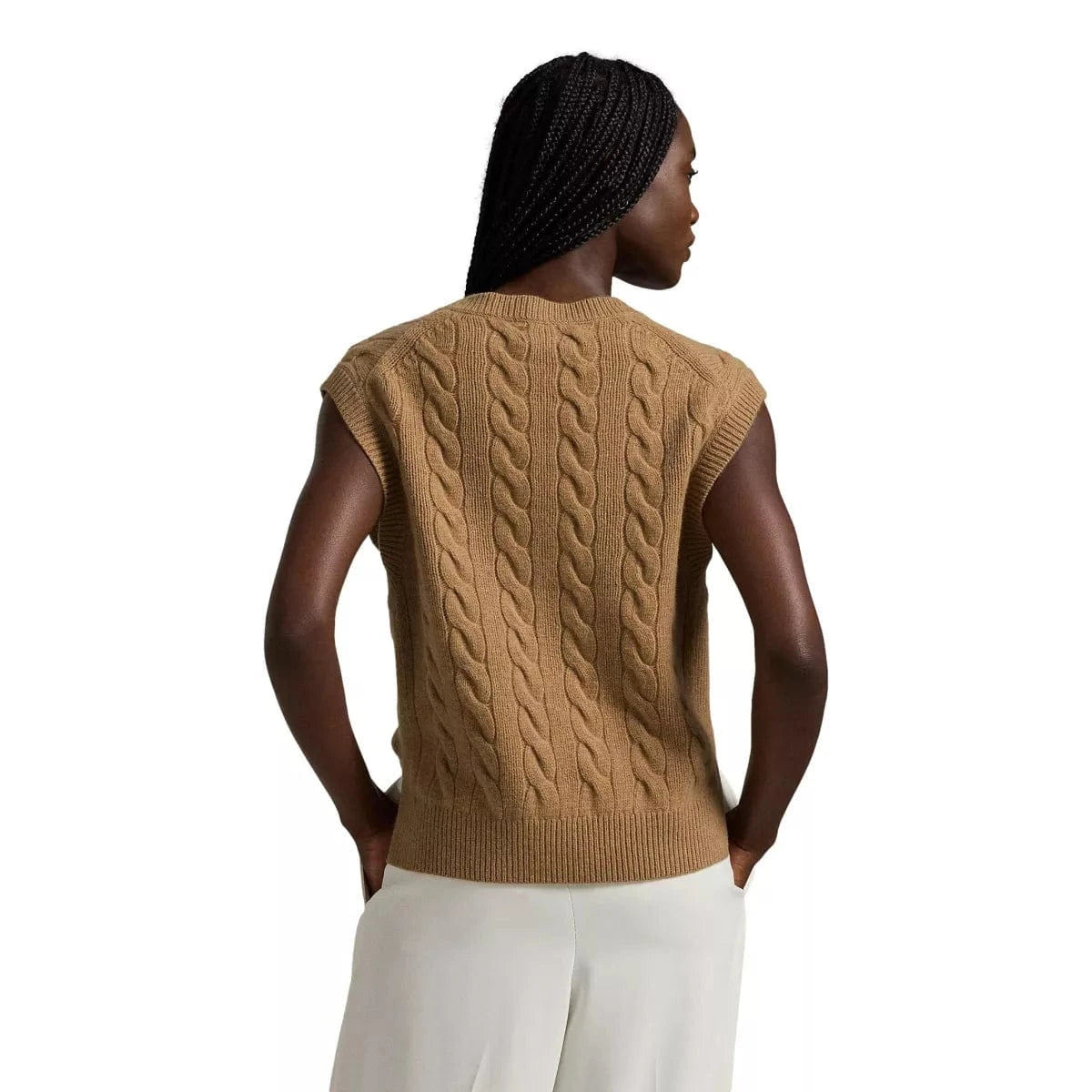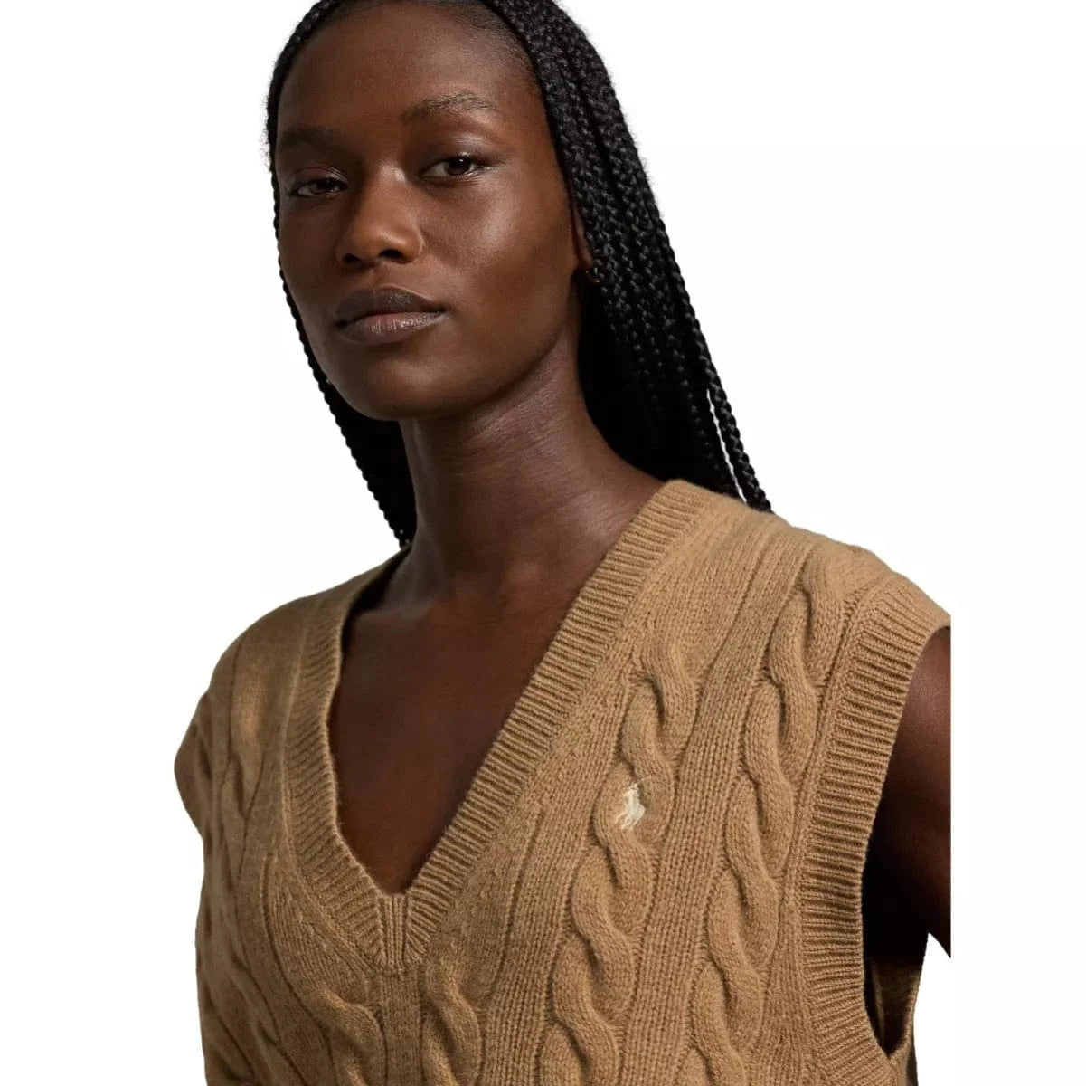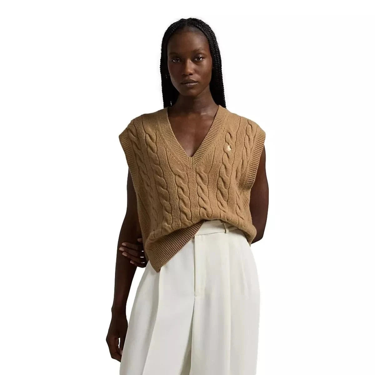 Deze spencer, gemaakt van een mix van grove Italiaanse wol en zacht kasjmier, combineert onze iconische kabelgebreide constructie met een ribgebreide afwerking en onze kenmerkende geborduurde Pony.