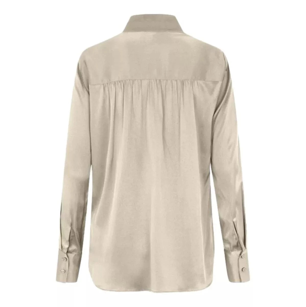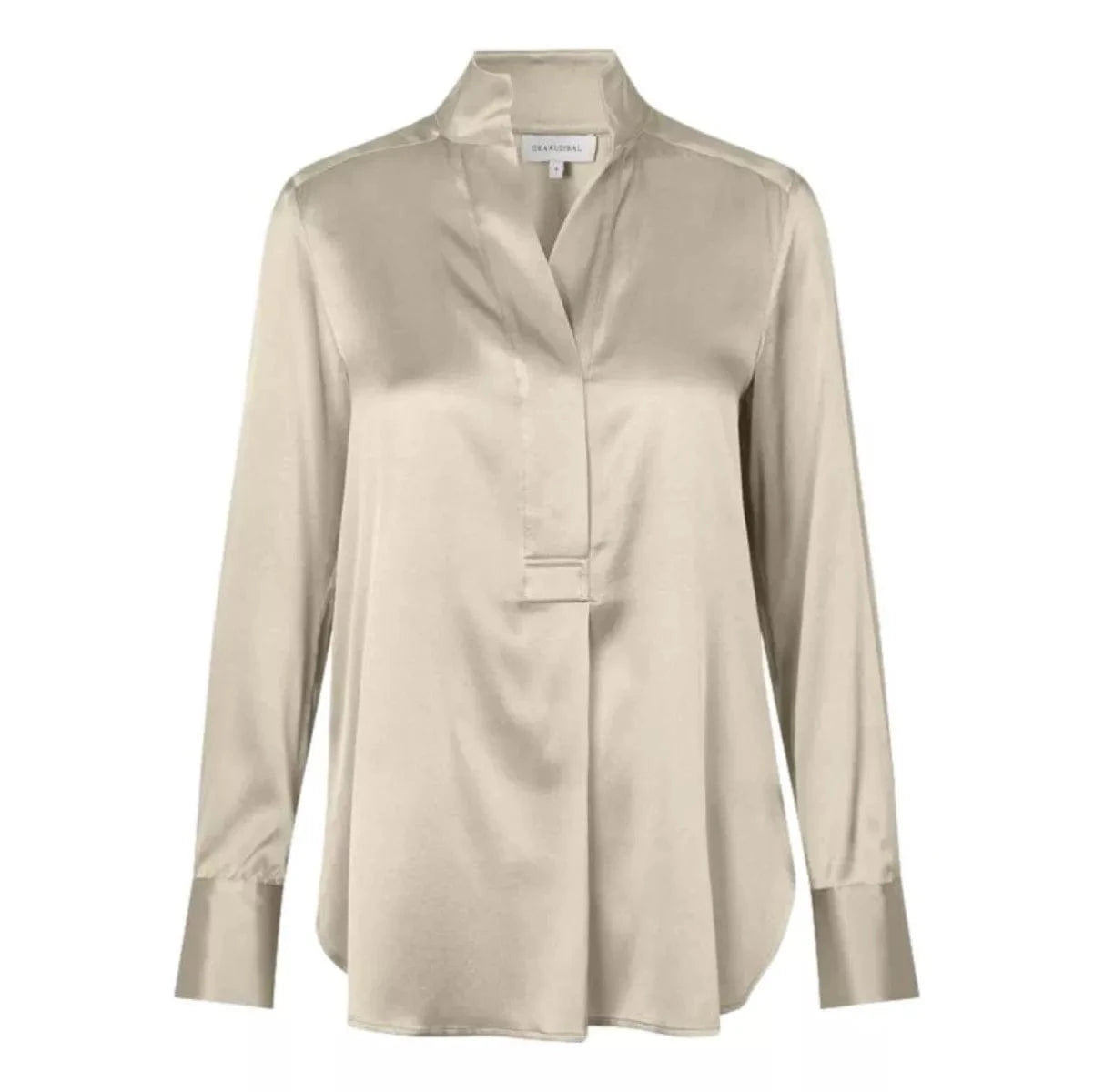 - Een v-hals met een gekruiste sluiting en een elegante opstaande kraag vormen de perfecte afwerking van deze prachtige zijden blouse. In een rijke oesterkleur is hij perfect voor zowel overdag als 's avonds.