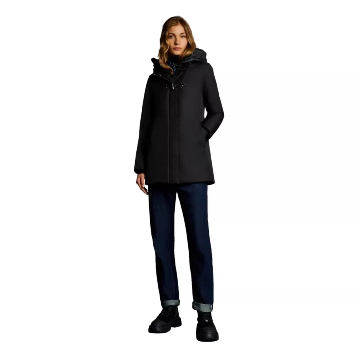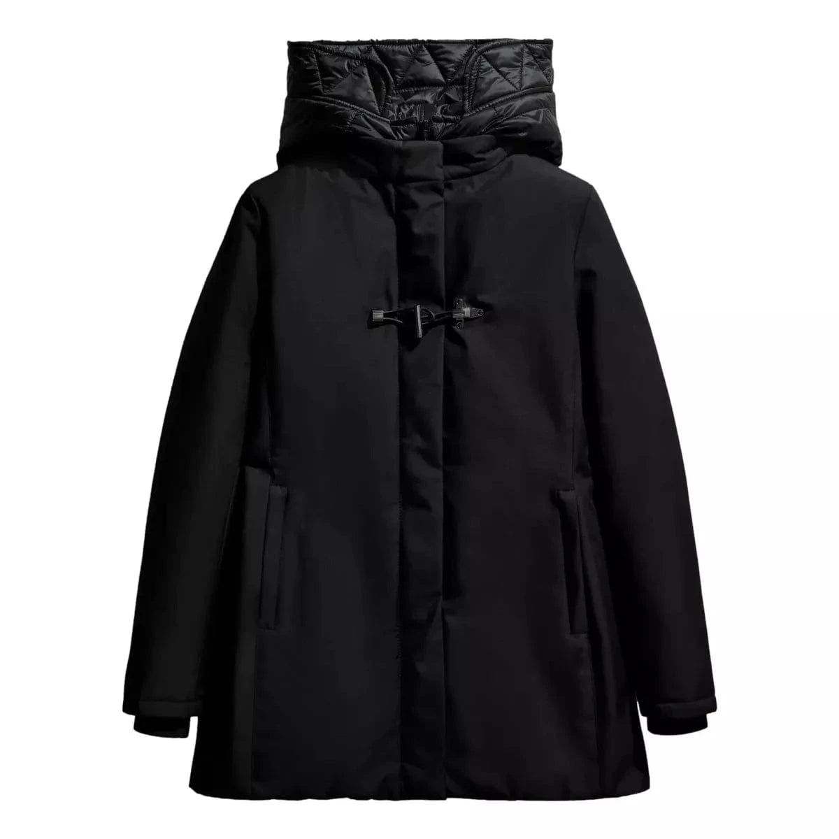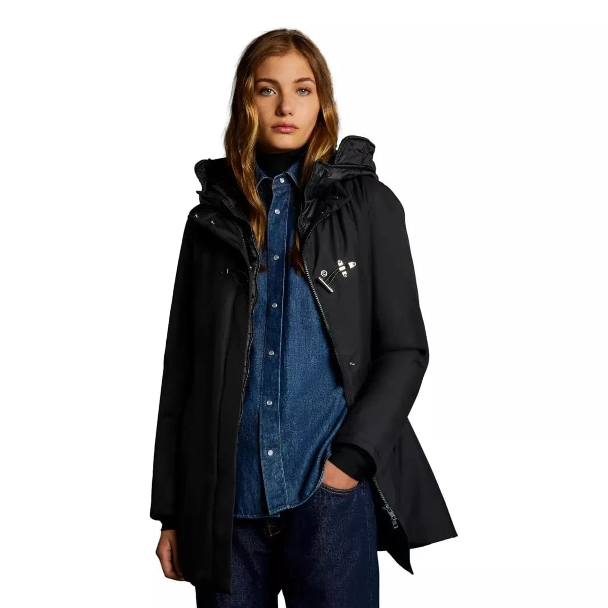 Iconic double front parka in water-repellent technical gabardine with breathable membrane. Characterized by windproof cuffs and zipped welt pockets, it comes with a detachable internal bib with a wide hood and wadding padding. The concealed zip and snap fastening is enhanced by Fay's frog. The interior of the parka is enhanced by the garment's name tag.