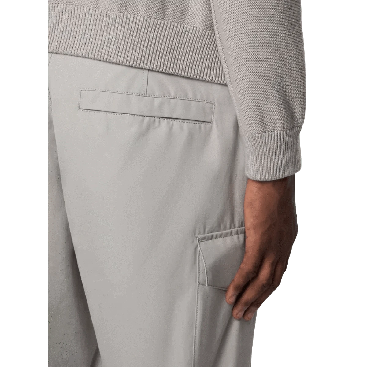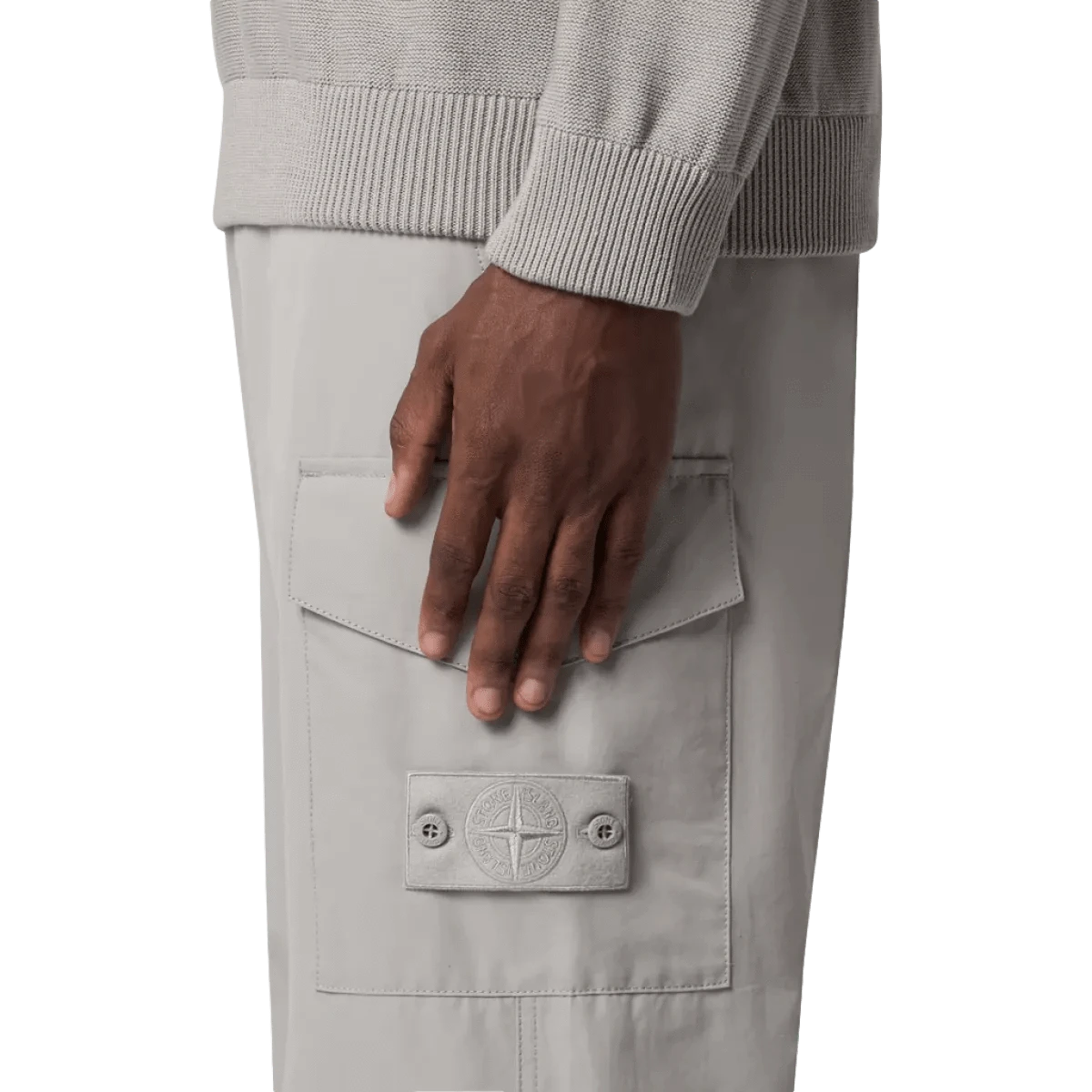 - Opgestikte zakken op de pijpen met klep en knoopsluiting; de linker is voorzien van het Stone Island Ghost-embleem.