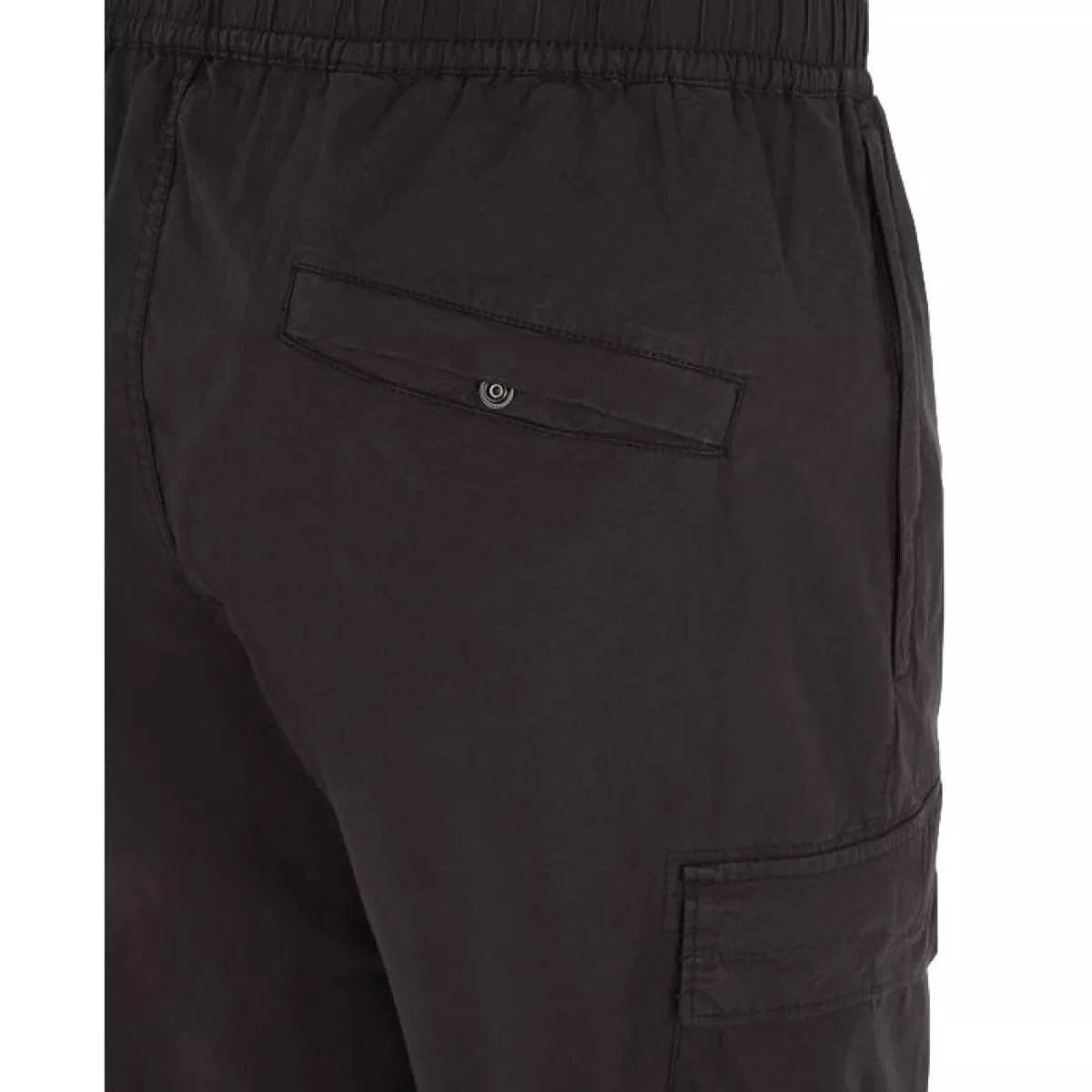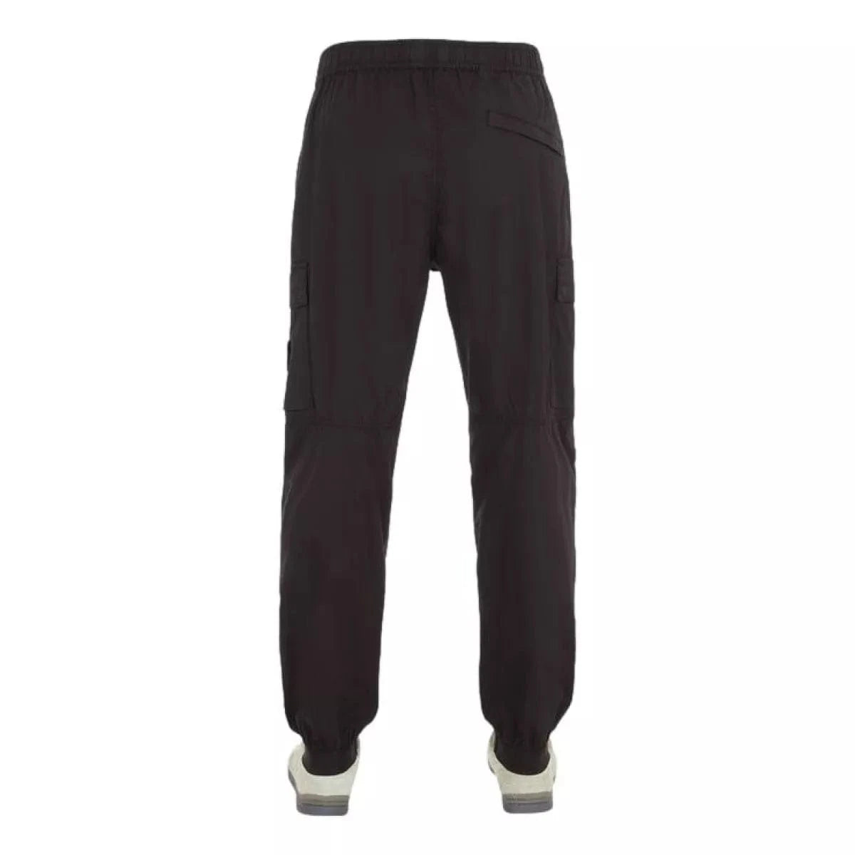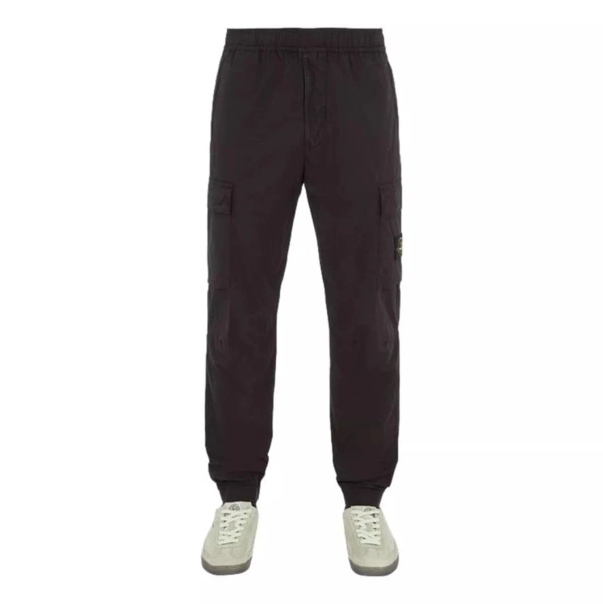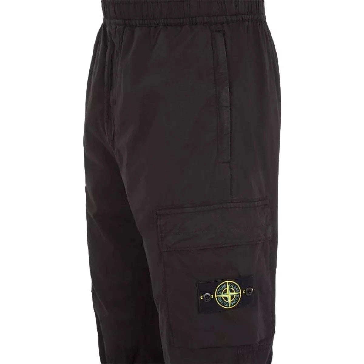 Normale, taps toelopende pasvorm. Handzakken in de naad met verborgen ritssluiting. Eén achterzak met verborgen drukknoopsluiting. Balgzak op de benen met klep en verborgen drukknoopsluiting; op de linkerzak staat de Stone Island-badge. Ingenaaide knieën. Elastische band op de broekspijpen. Elastische taille met binnenkoord. Ritssluiting.