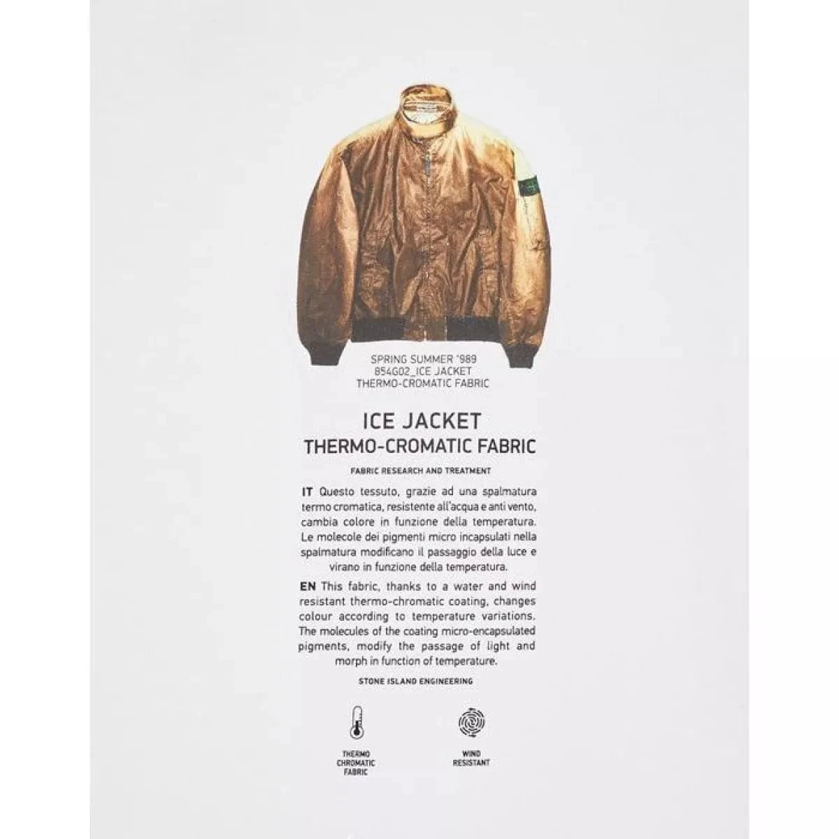 T-shirt met korte mouwen van katoenen jersey. Archivio is een project dat Stone Island's textielexperiment en innovatie illustreert. Deze onderzoeksmethode staat al bijna veertig jaar bekend als een leidraad in de mode- en designwereld. Elk seizoen vertelt een T-shirt het verhaal van een stof die een symbool is geworden van dit gepassioneerde onderzoek. Een venster op het label dat aan het kledingstuk is bevestigd, bevat een monster van de stof.
