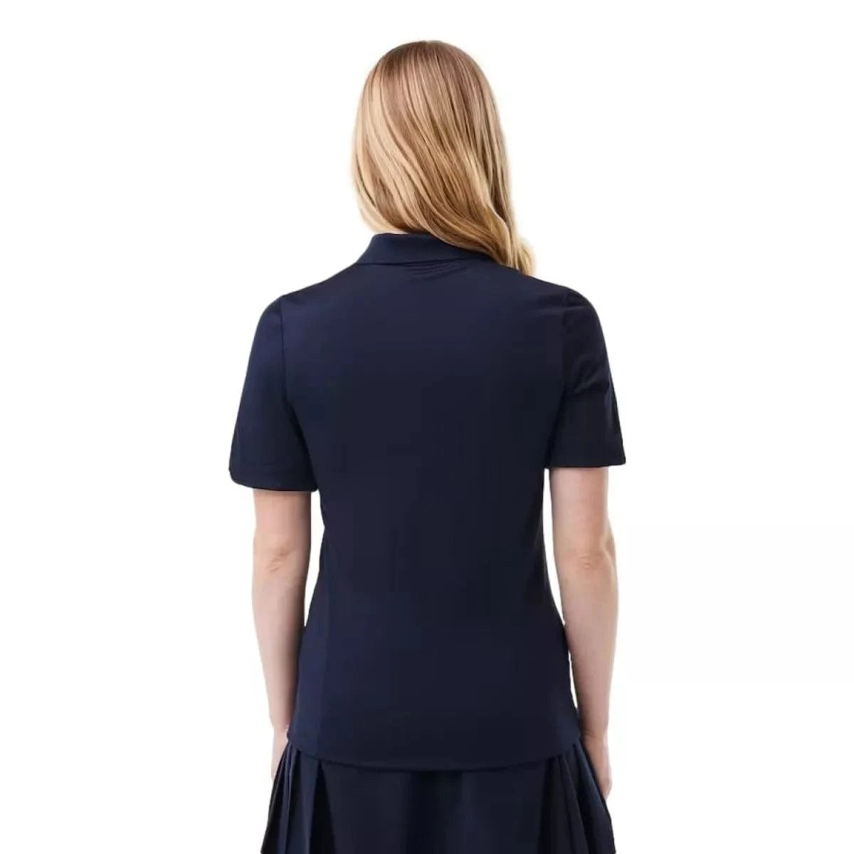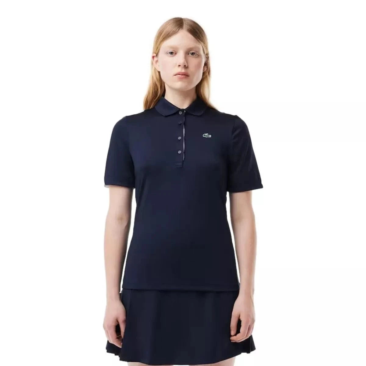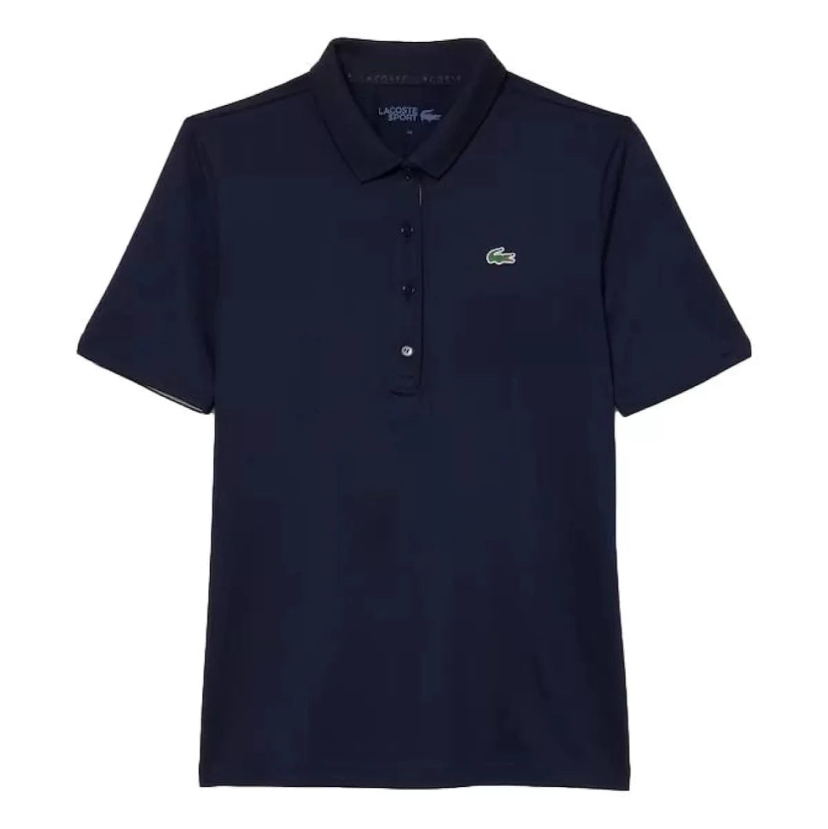 Met deze Lacoste Sport/Golf Polo in marine van ademende jersey met stretch ben je verzekerd van minimalistische en elegante flair op de golfbaan. Een sportieve essential met ultra-dry-technologie en details die zorgen voor comfort en frisheid. De geribbelde polokraag heeft een vrouwelijke knooppas met vier knopen en een contrasterend lipje met dezelfde afwerkingen als de binnenkant van de mouwen.