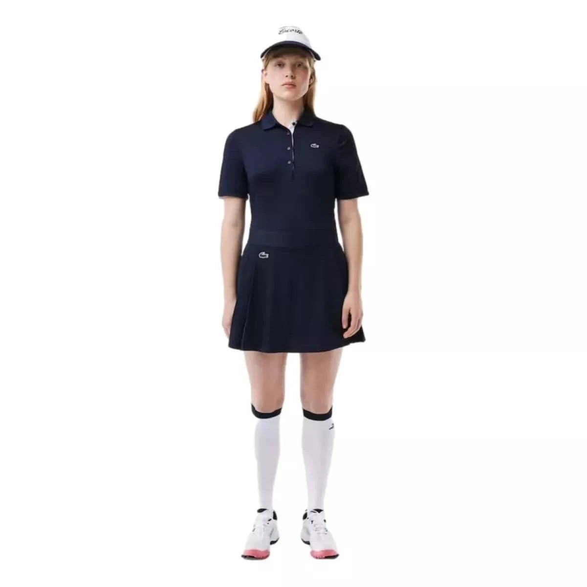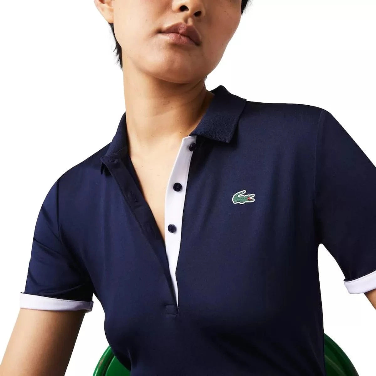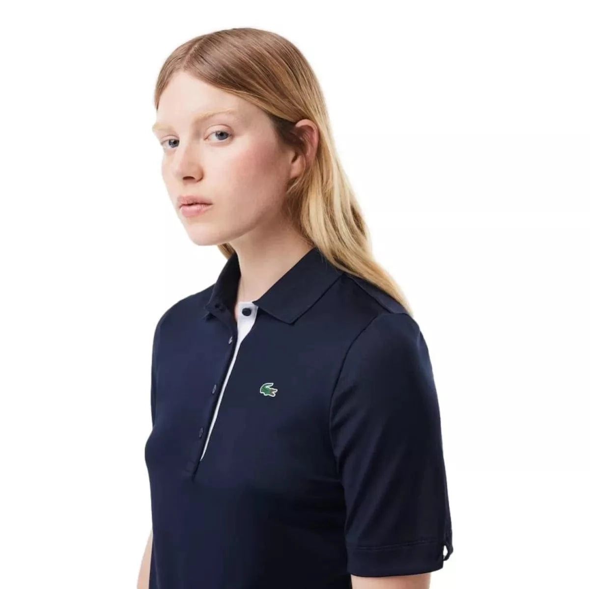 Met deze Lacoste Sport/Golf Polo in marine van ademende jersey met stretch ben je verzekerd van minimalistische en elegante flair op de golfbaan. Een sportieve essential met ultra-dry-technologie en details die zorgen voor comfort en frisheid. De geribbelde polokraag heeft een vrouwelijke knooppas met vier knopen en een contrasterend lipje met dezelfde afwerkingen als de binnenkant van de mouwen.