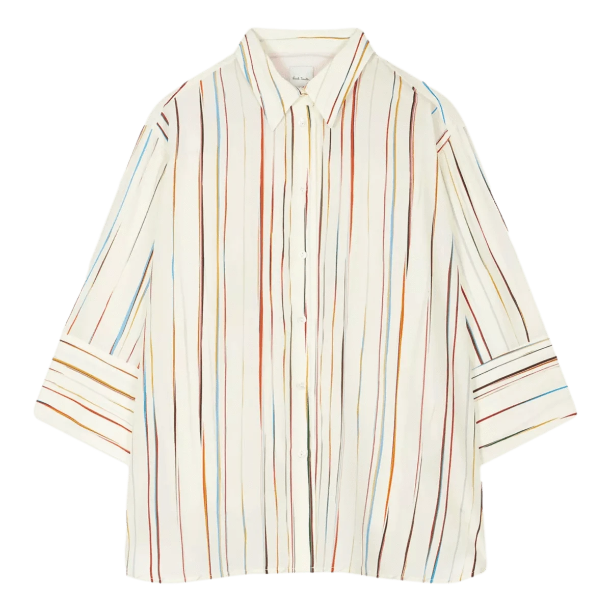 Add a touch of luxury and character to your wardrobe with the Paul Smith Signature Stripe Silk Shirt. This multicolour shirt is crafted from 100% silk, giving it a silky-soft feel and a refined sheen. The iconic Paul Smith Signature Stripe design gives the shirt a modern, playful look, making it perfect for both formal and casual occasions.