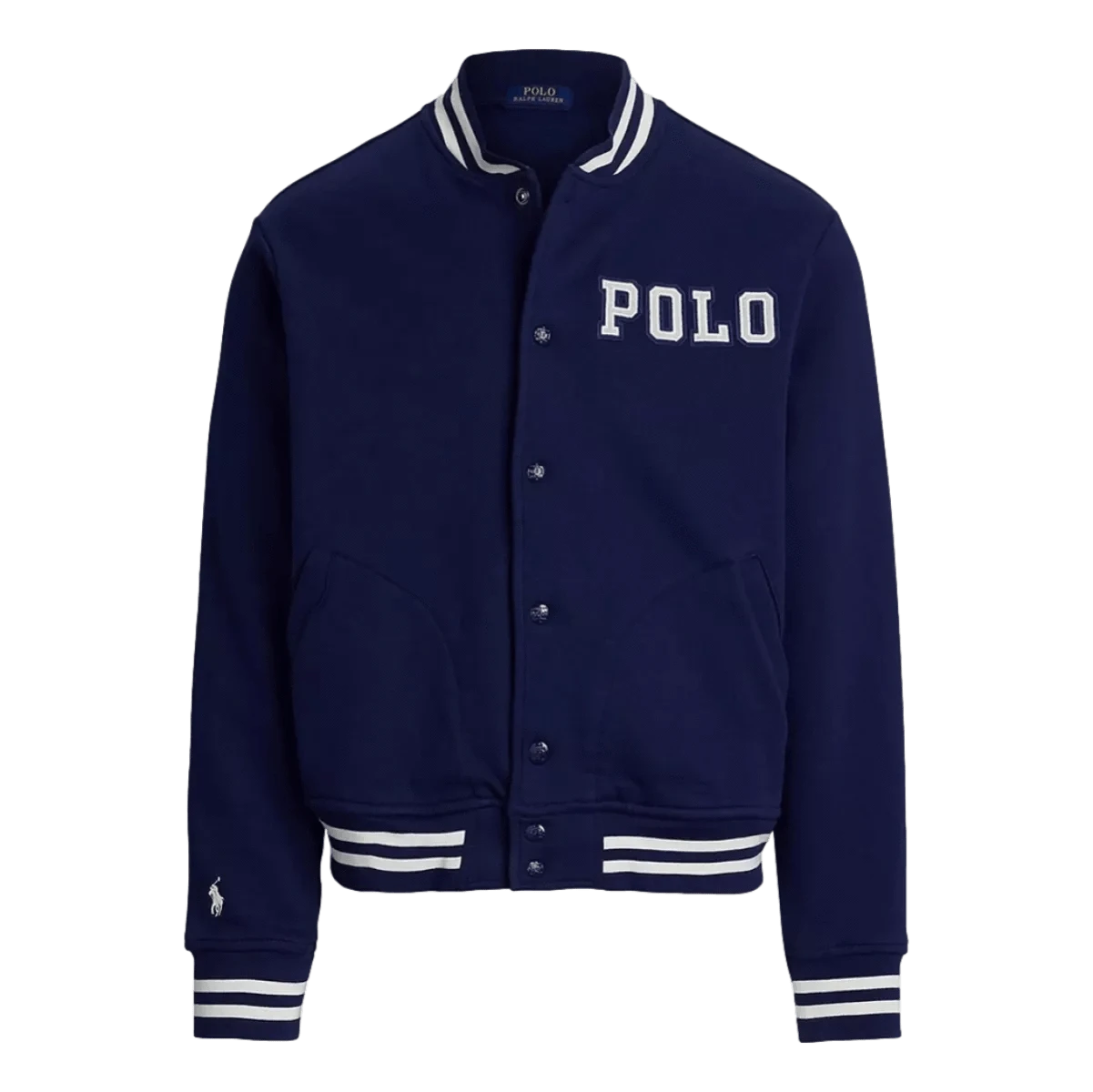 Een moderne klassieker met een sportieve twist. Dit college-jack van Polo Ralph Lauren is gemaakt van een zachte katoenmix en afgewerkt met iconische details zoals het geborduurde polo-logo op de borst en mouw. De geribde boorden en drukknoopsluiting zorgen voor een comfortabele, tijdloze fit.