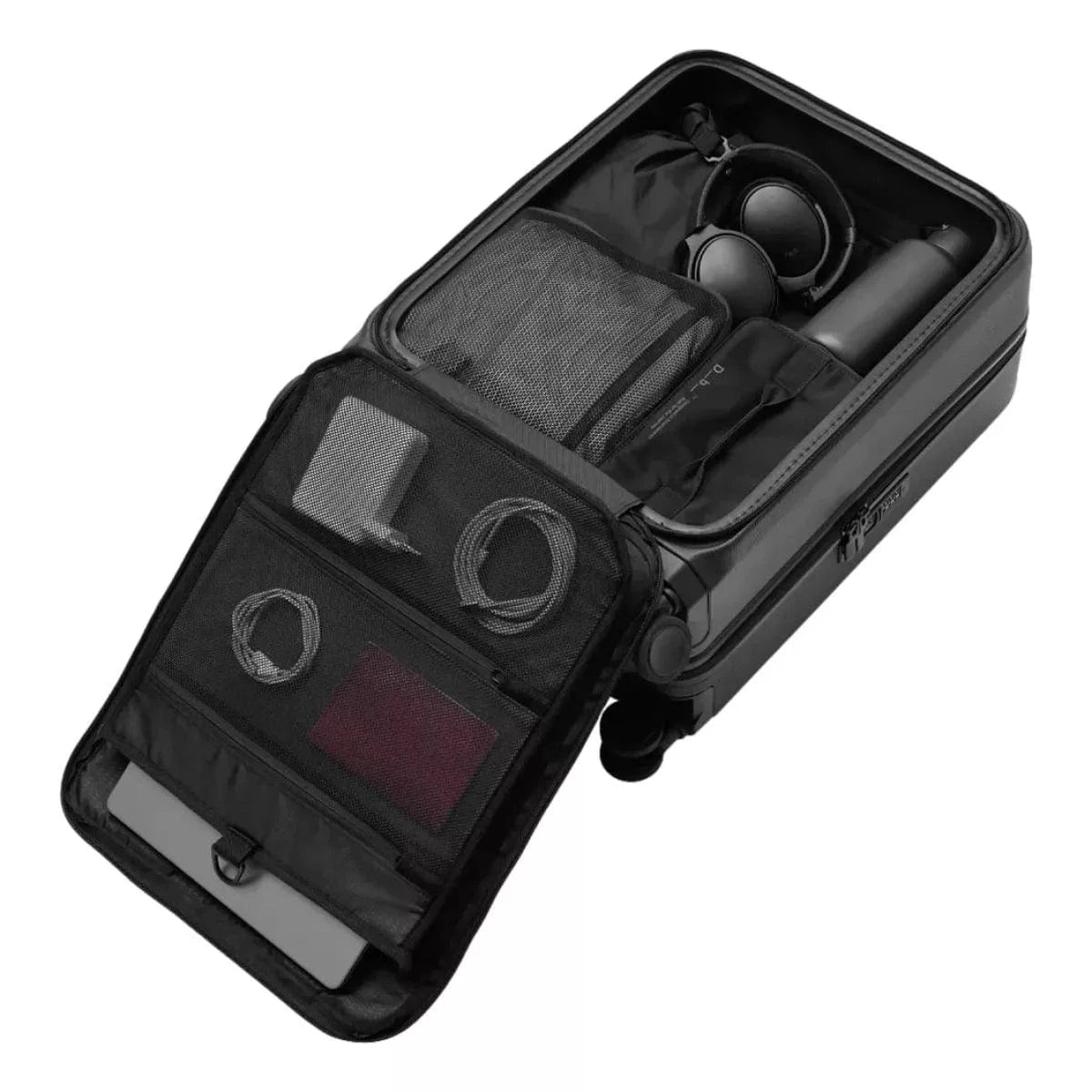Maak kennis met de DB Journey Front-Access Ramverk Carry-on handbagage koffer, een essentiële metgezel voor de veeleisende reiziger die stijl en functionaliteit hoog in het vaandel heeft staan. Met een royale inhoud van 36 liter biedt deze handbagage koffer ruimte voor al jouw reisbenodigdheden. Vervaardigd uit 100% gerecycled polyester, straalt deze koffer niet alleen duurzaamheid uit maar is ook milieuvriendelijk. Dankzij het laptopvak voor een 16-inch laptop en meerdere opbergvakken blijven je spullen georganiseerd en gemakkelijk bereikbaar. De uitschuifbare trekstang en de fluisterstille Japanse Hinomoto 360° wielen zorgen ervoor dat je gemakkelijk door de luchthaven rolt. Het TSA-slot biedt extra veiligheid. Ontdek de veelzijdige DB Journey Spinner Front-Access Ramverk Carry-on handbagage koffer en je wilt niks anders meer!
