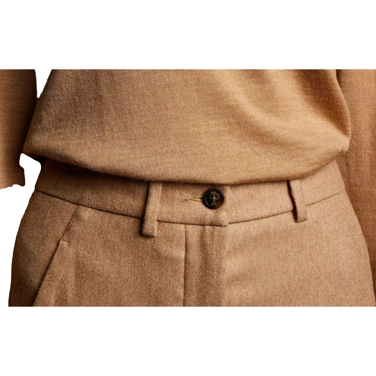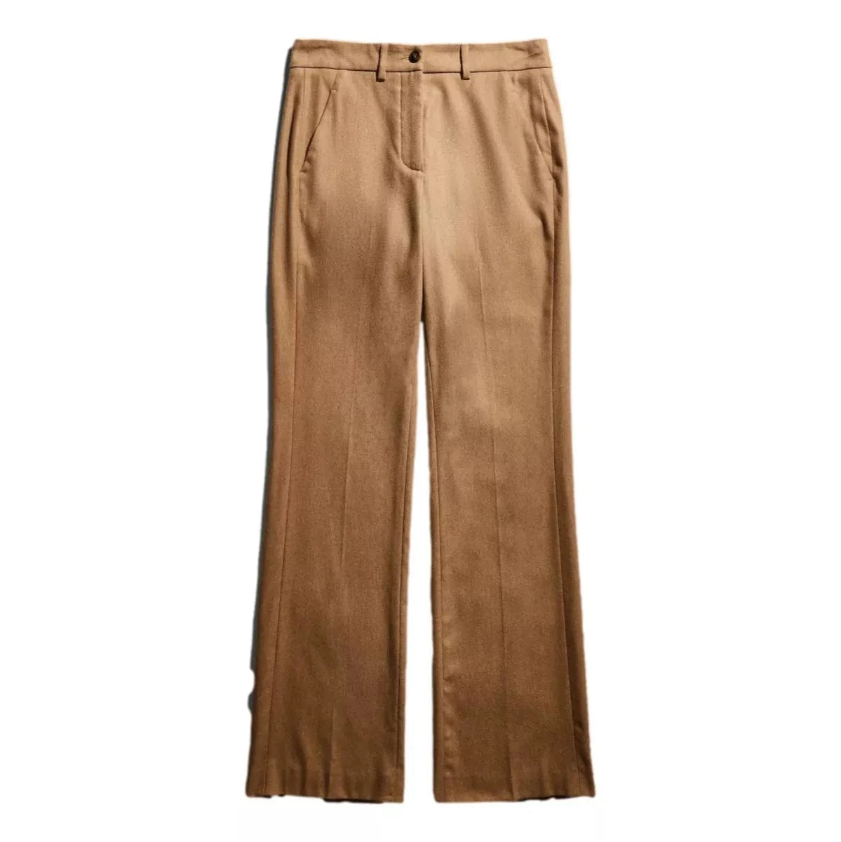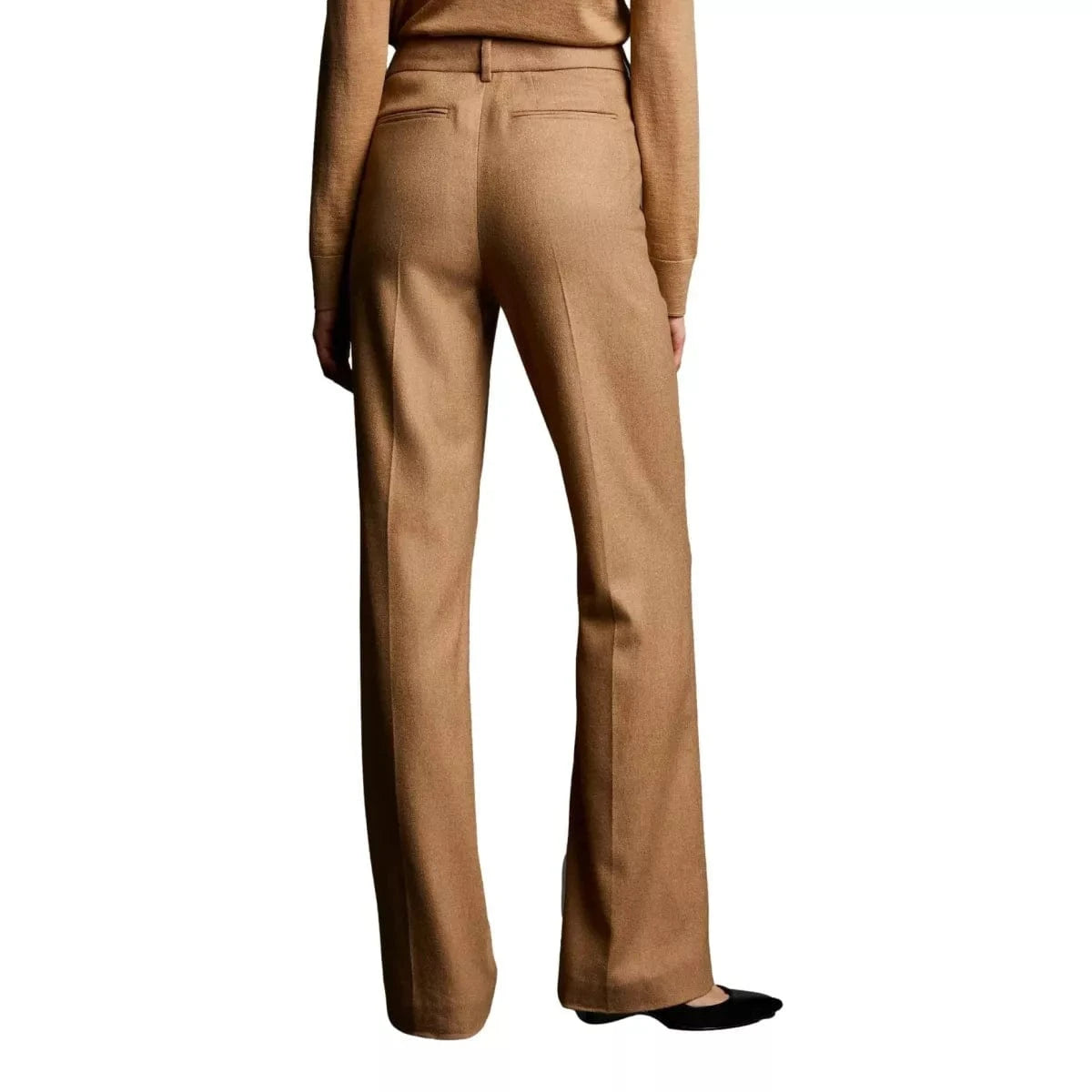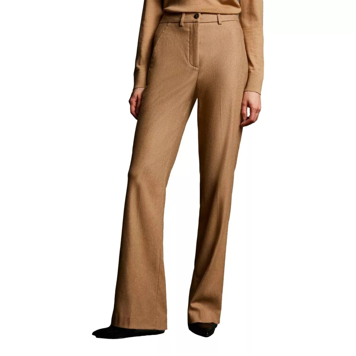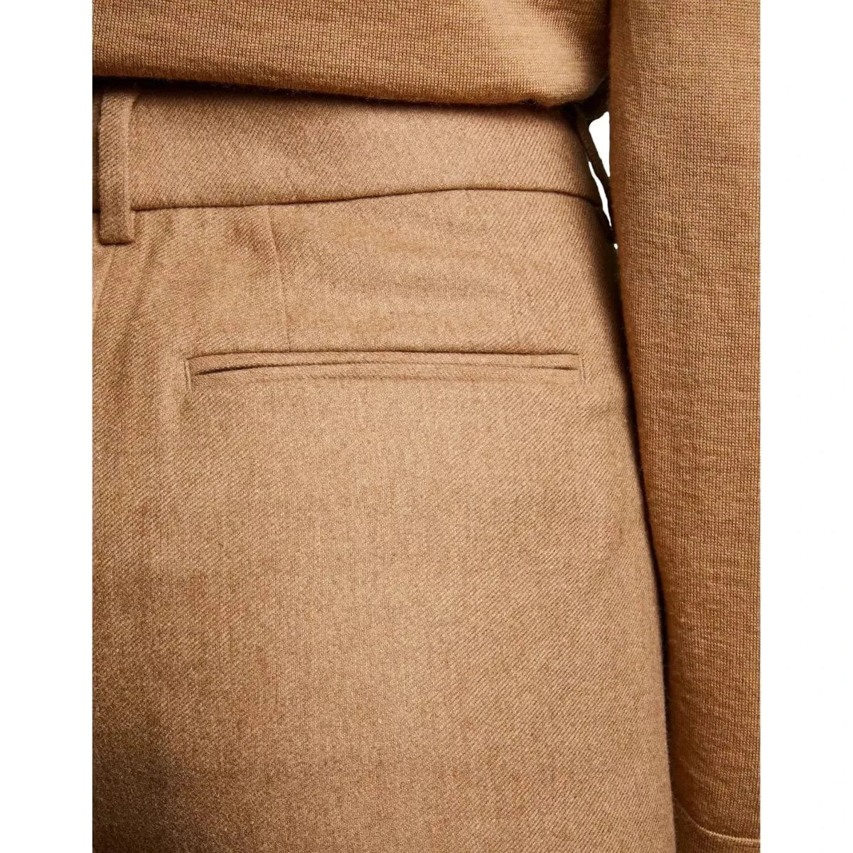 Straight leg trousers in stretch wool blend flannel, with ironed crease. Characterized by slanted front pockets and double welt back pockets, they come with zip and branded button fastening.