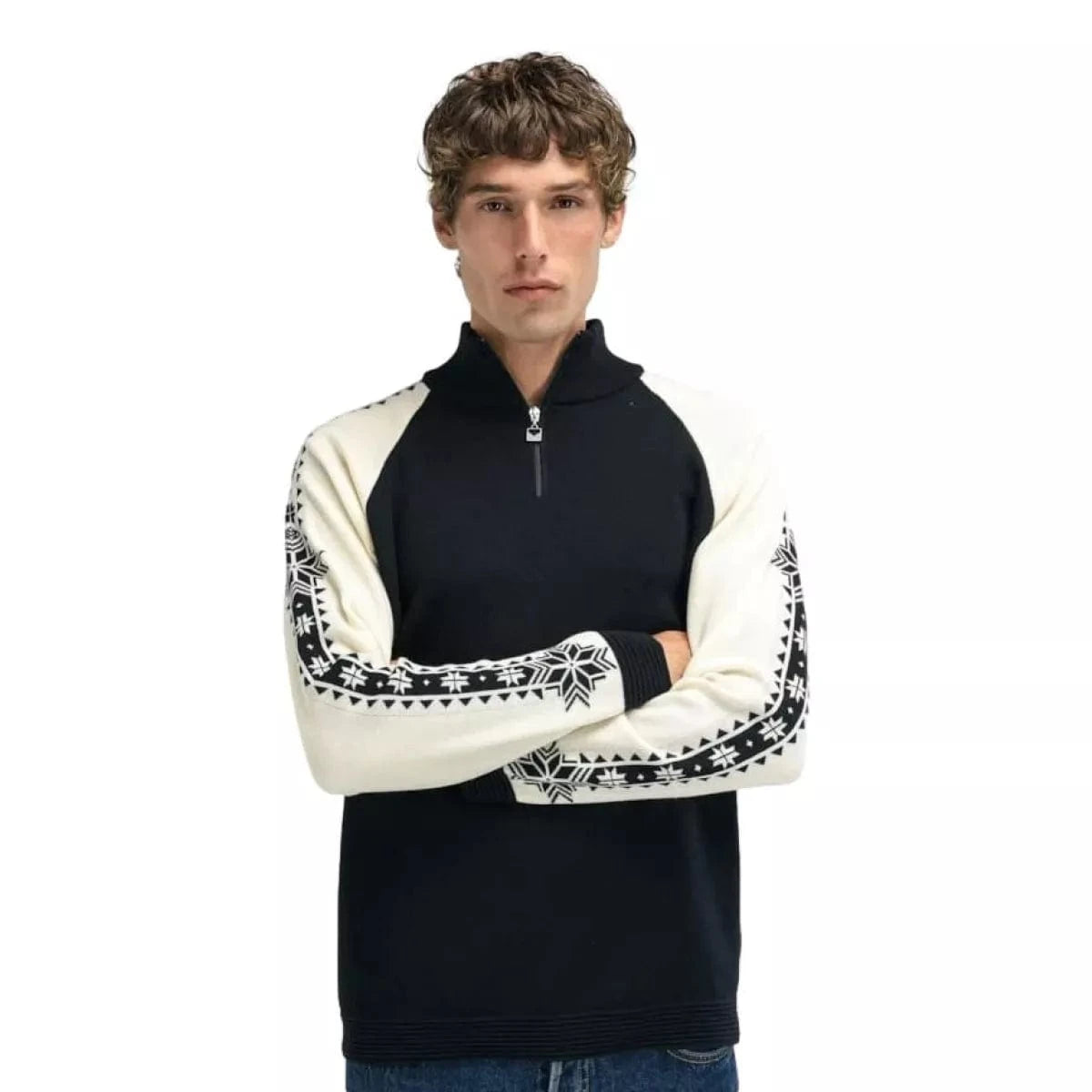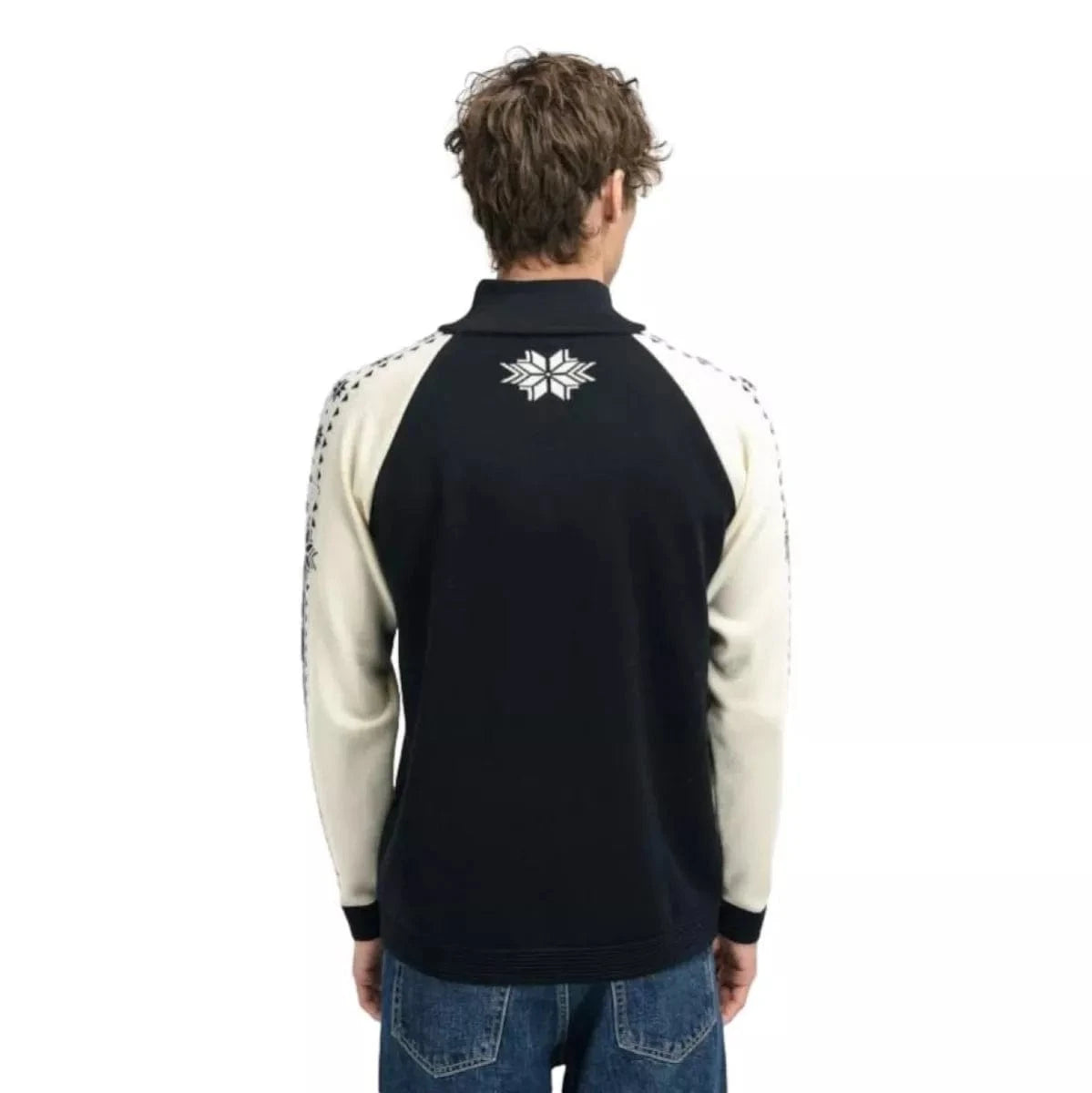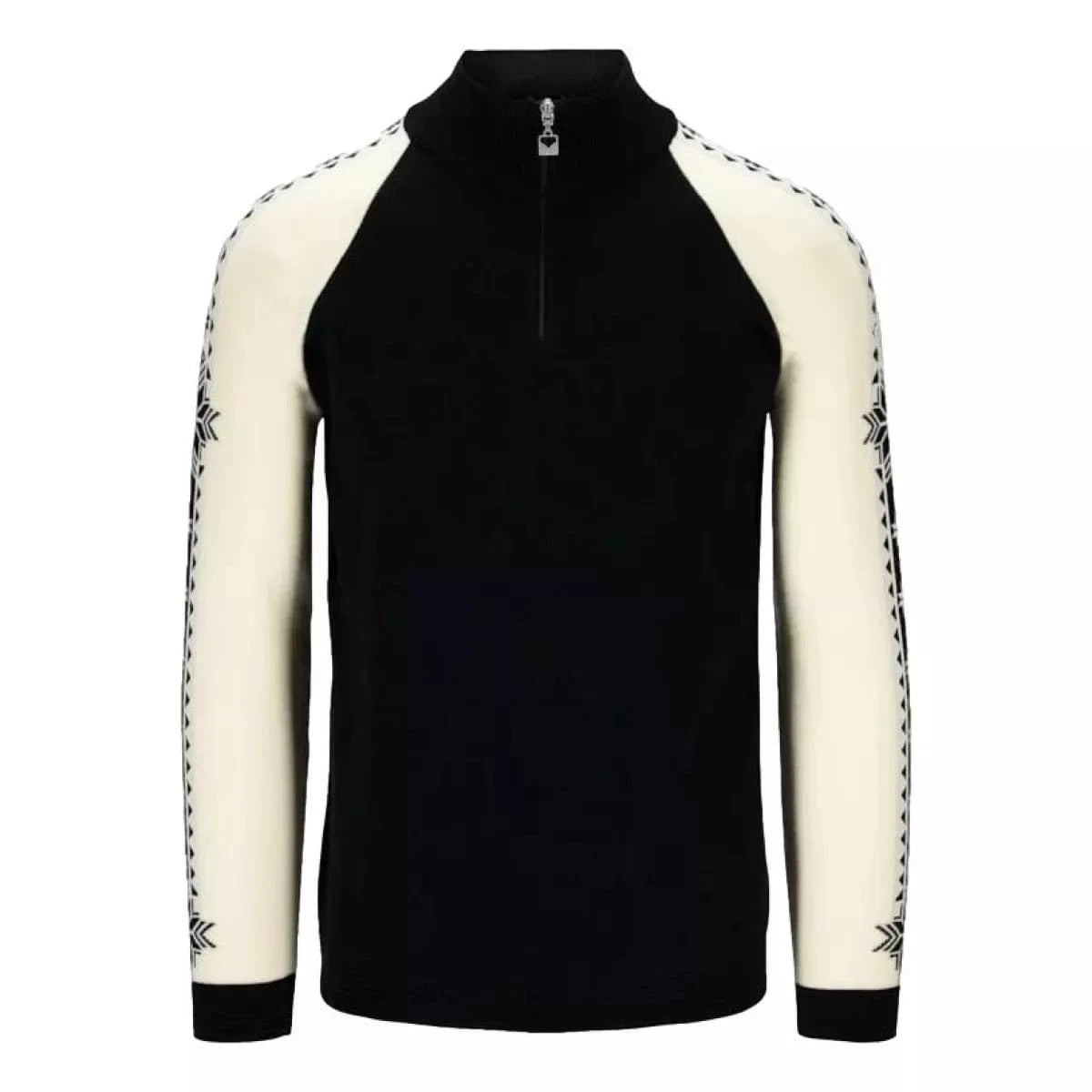 Named after Geilo, one of the best-known ski areas in Norway, this sporty and attractive sweater is made of 100% premium skin soft merino wool. The durable double-knit construction makes it ideal for an active lifestyle. A repetitive pattern with the Norwegian eight-petal rose along the sleeves, and a large eight-petal rose knitted into the back gives this sweater a truly sporty look. Some colorways feature contrasting sleeves.