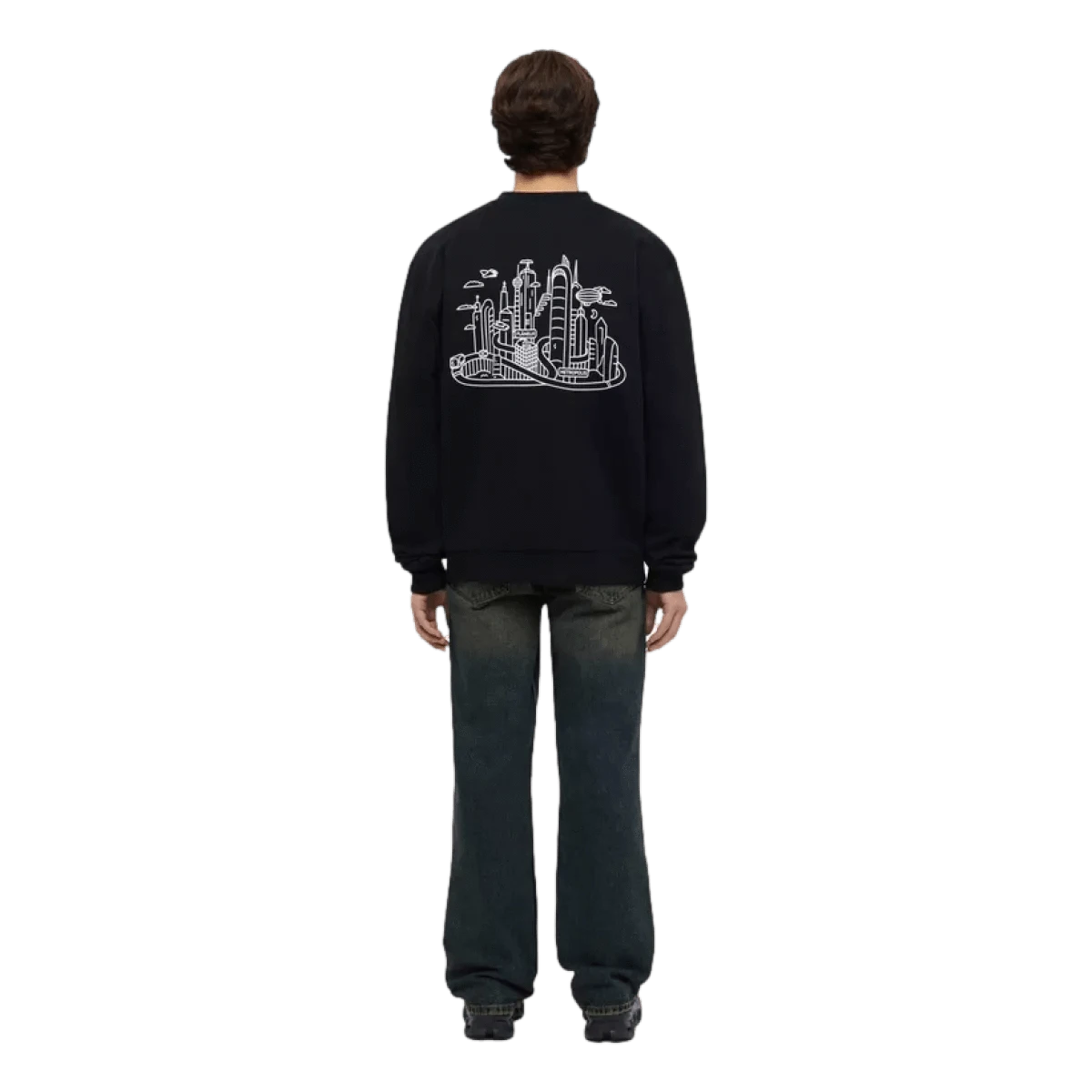 trui met metropool lijntekening print. Onze naleving van de GOTS-certificering garandeert een milieuvriendelijke en sociaal verantwoorde productie, van grondstoffen tot etikettering, en toont onze niet aflatende inzet voor duurzaamheid en kwaliteit.