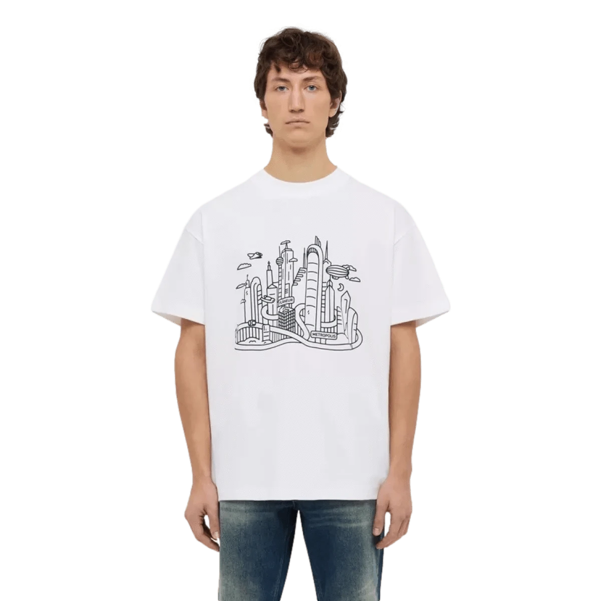 t-shirt met metropool op de voor- en achterkant met lijntekeningprint. Onze naleving van de GOTS-certificering garandeert een milieuvriendelijke en sociaal verantwoorde productie, van grondstoffen tot etikettering, en toont onze onwrikbare toewijding aan duurzaamheid en kwaliteit.