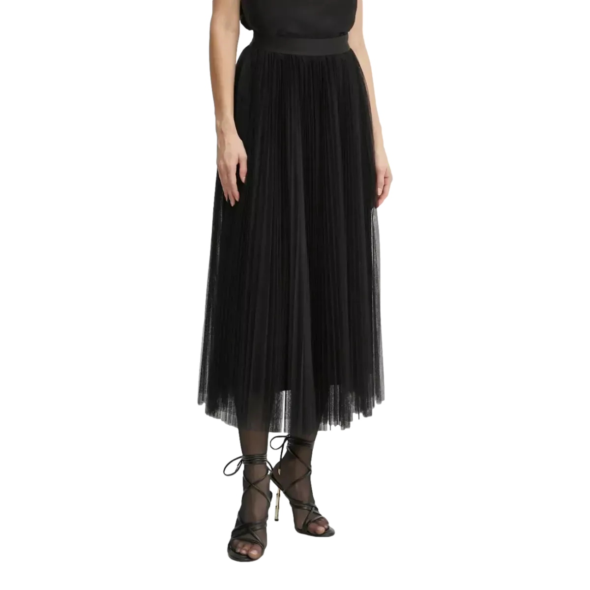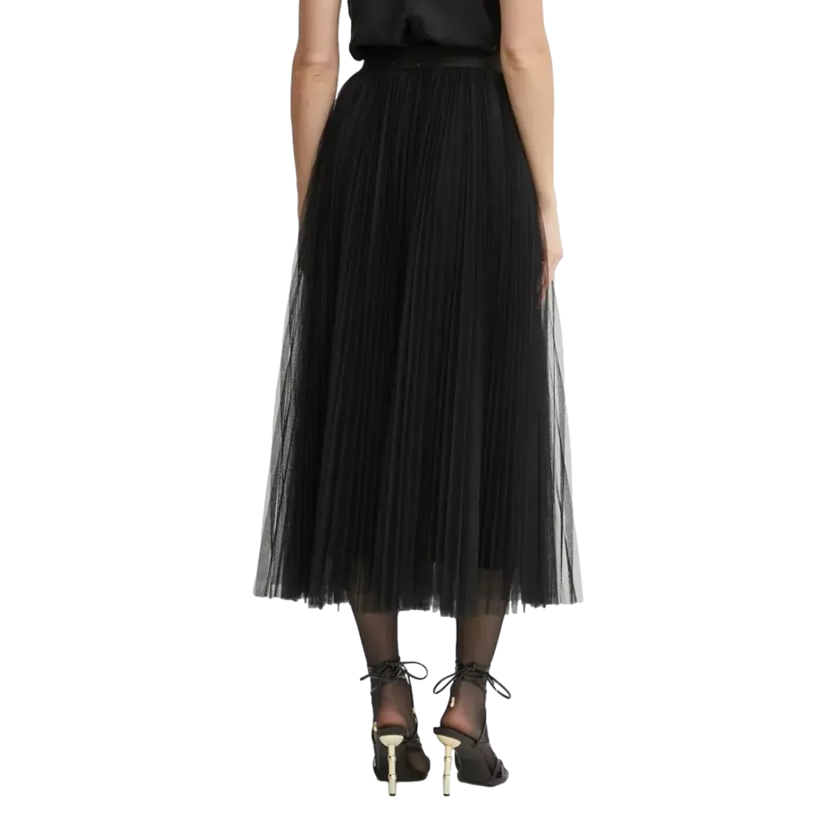 De luchtige tulen stof geeft de rok een vrouwelijke, dromerige uitstraling, terwijl de fijne plooien zorgen voor een mooie, vloeiende beweging tijdens het dragen. Dankzij de klassieke zwarte kleur is deze rok eenvoudig te combineren met zowel casual als chique outfits.