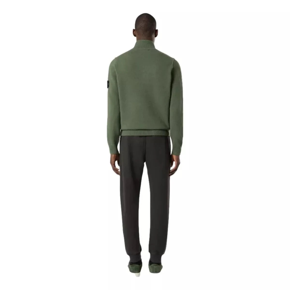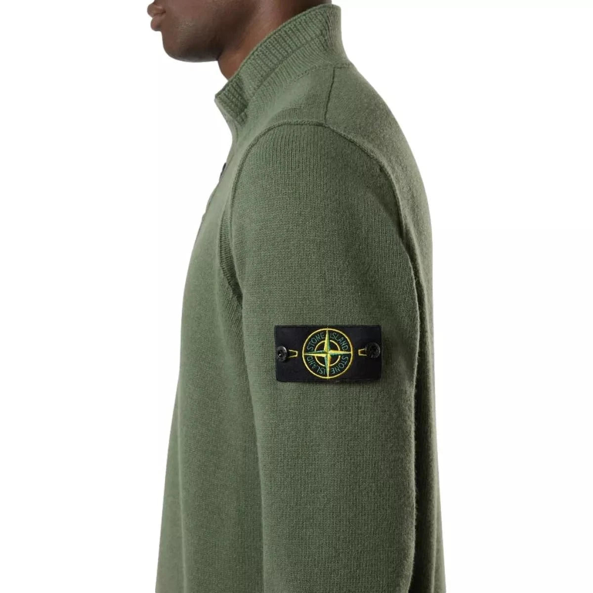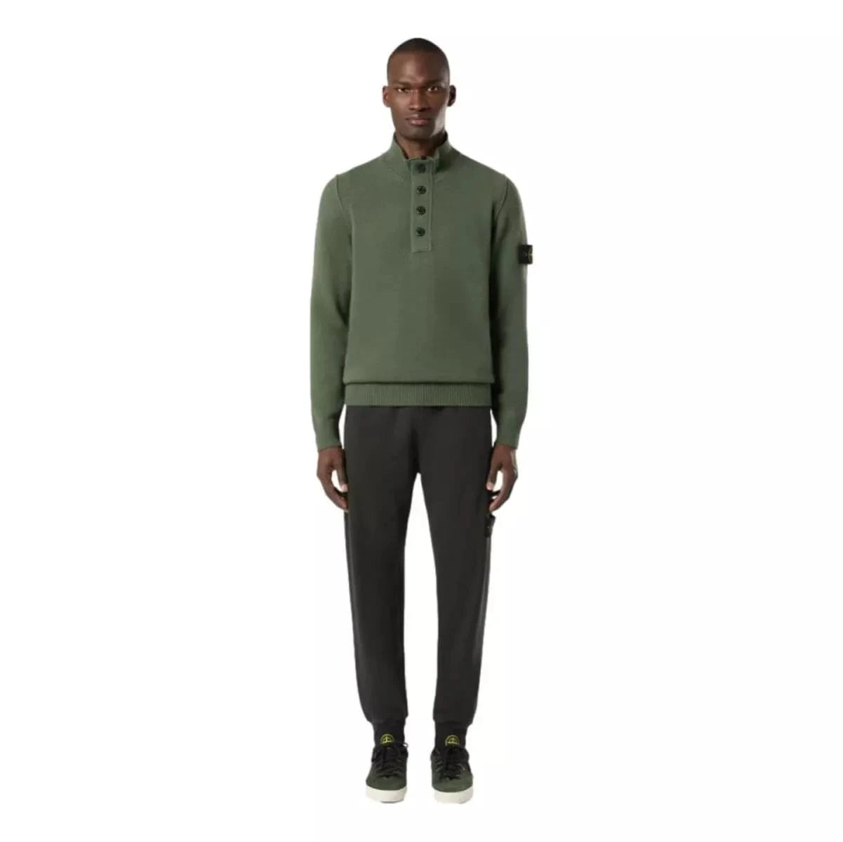Opstaande geribde kraag, aan de binnenkant afgebiesd met vilten band. Verborgen ritssluiting en vier knopen bij de hals. Bandmotief in omgekeerde koussteek op schouders en armsgat voor. Verhoogde naden bij de armsgaten. Stone Island-badge op de linkermouw. Geribde manchetten en onderkant. Normale pasvorm.