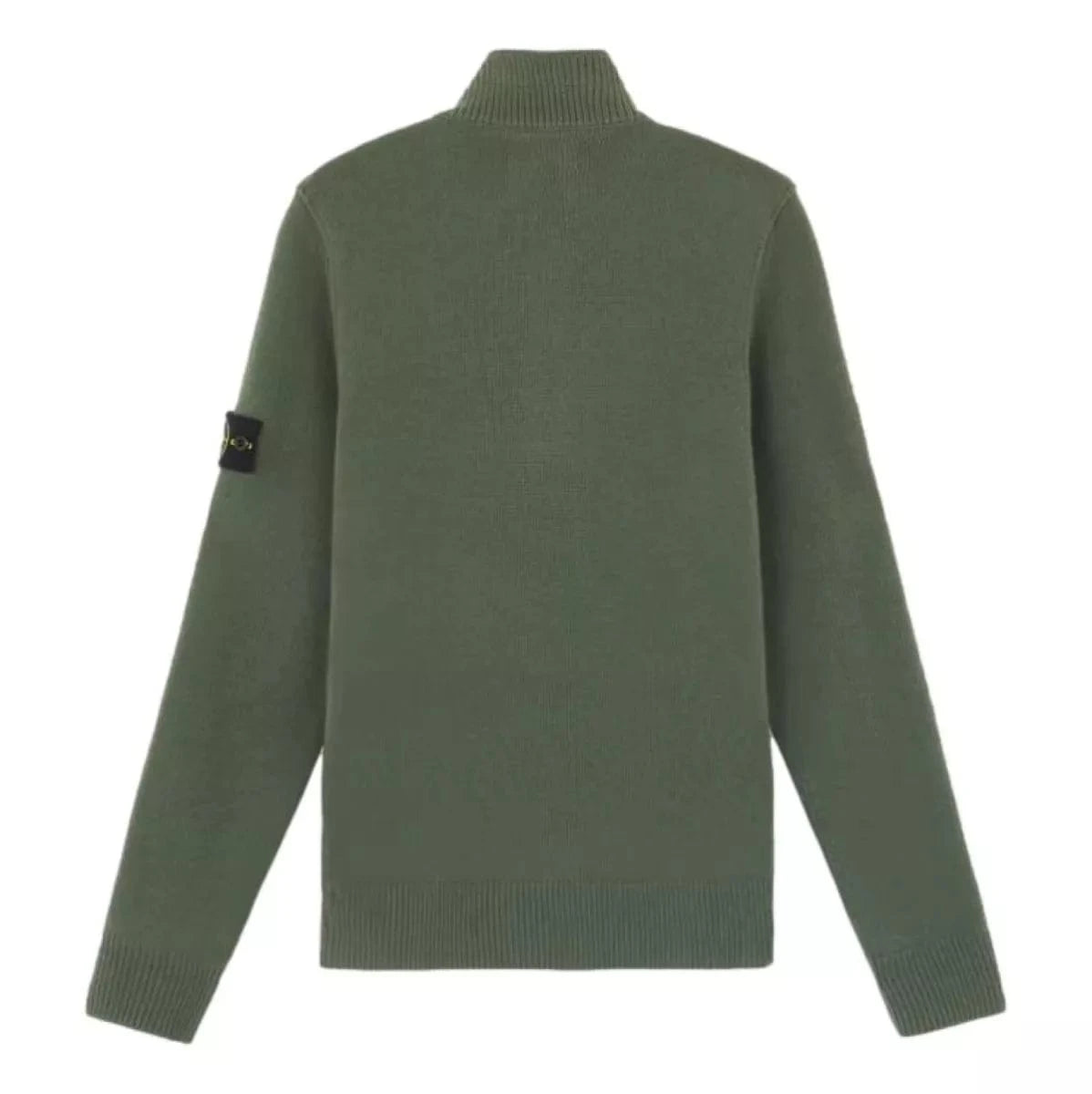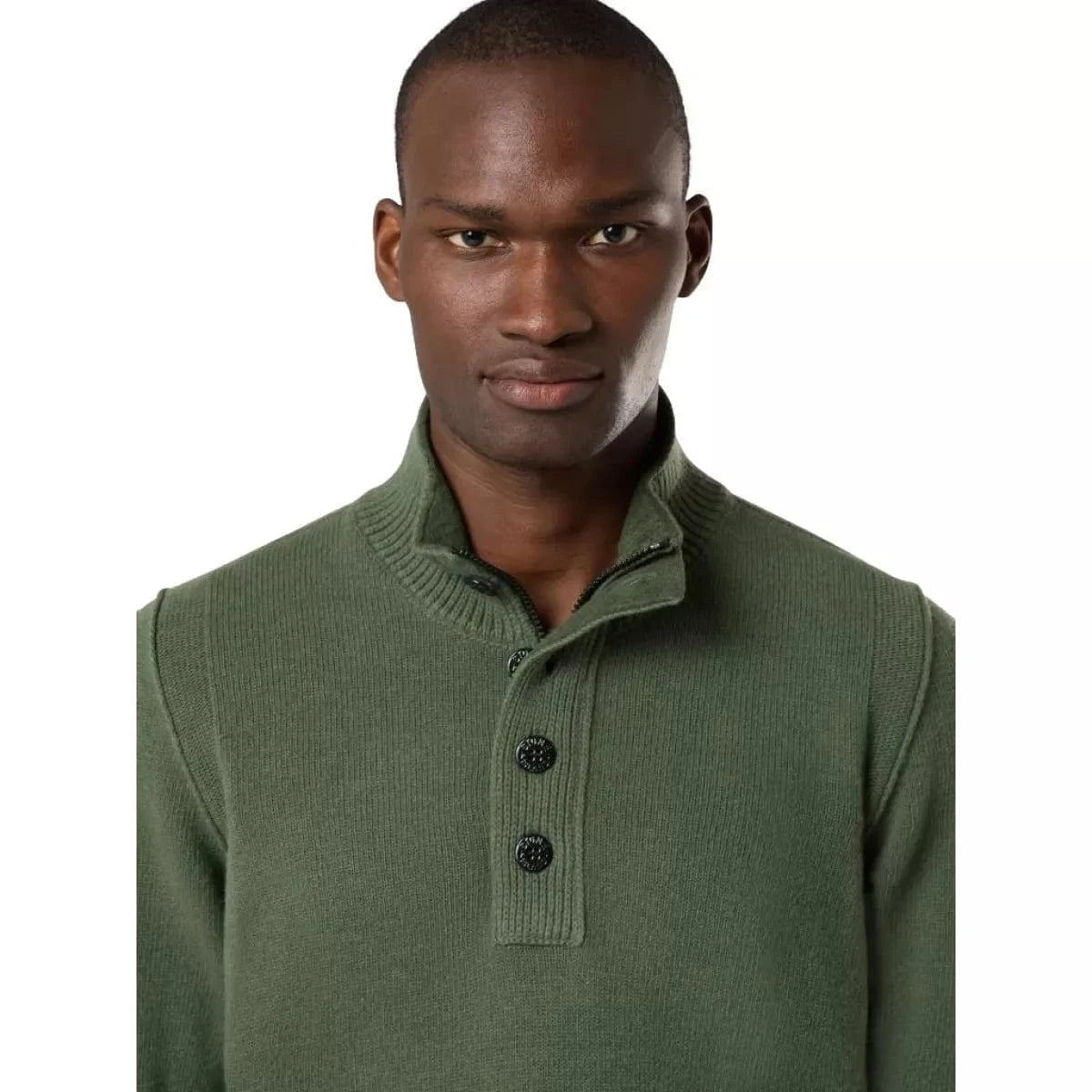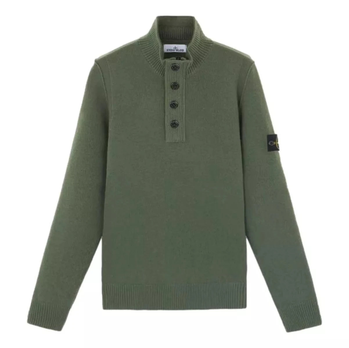 Opstaande geribde kraag, aan de binnenkant afgebiesd met vilten band. Verborgen ritssluiting en vier knopen bij de hals. Bandmotief in omgekeerde koussteek op schouders en armsgat voor. Verhoogde naden bij de armsgaten. Stone Island-badge op de linkermouw. Geribde manchetten en onderkant. Normale pasvorm.