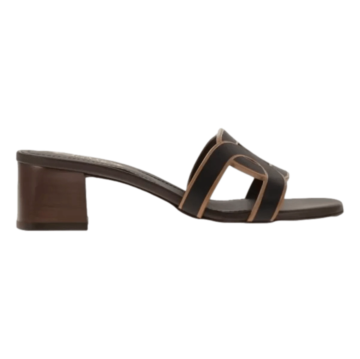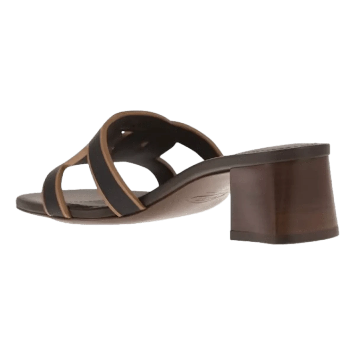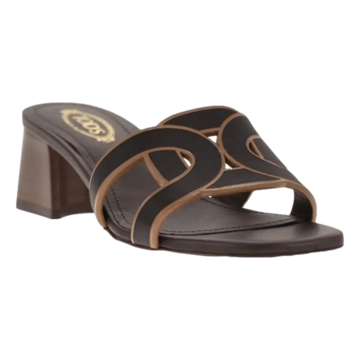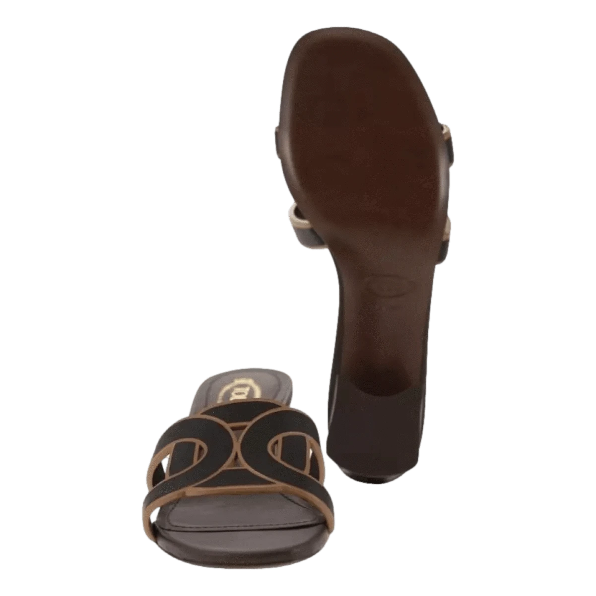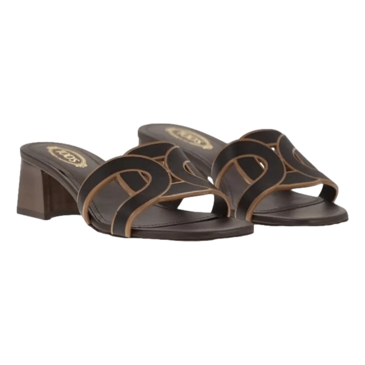 Step into summer with the Tod's Heeled Mules in black/brown. Crafted from soft leather, these sandals feature a contoured strap inspired by the brand’s iconic chain accessory, offering a refined and timeless look. The wide, comfortable 5 cm heel provides both support and elegance, while the leather sole ensures durability and comfort, making them perfect for long summer days.