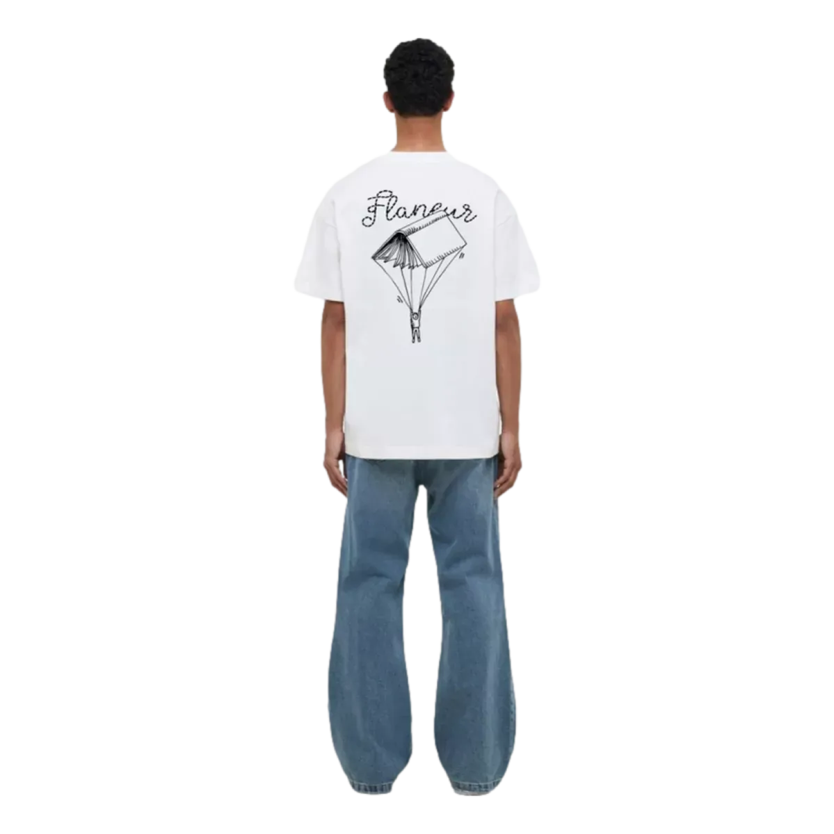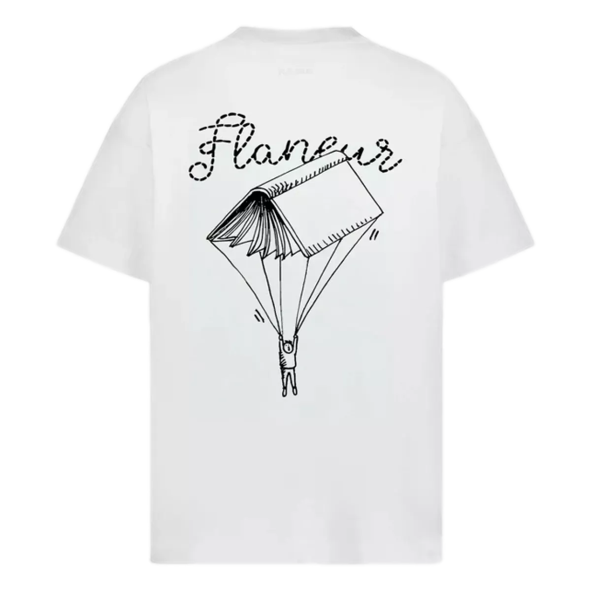 Voor de dromers, denkers en ontdekkers: dit T-shirt van Flaneur brengt stijl en verhaal samen. Met de handgetekende illustratie van een zwevend boek-parachute op voor- en achterkant, is dit shirt een creatieve knipoog naar nieuwsgierigheid en vrijheid. Gemaakt van stevig katoen met een relaxte fit – ideaal voor wie het leven op z’n eigen tempo leest.