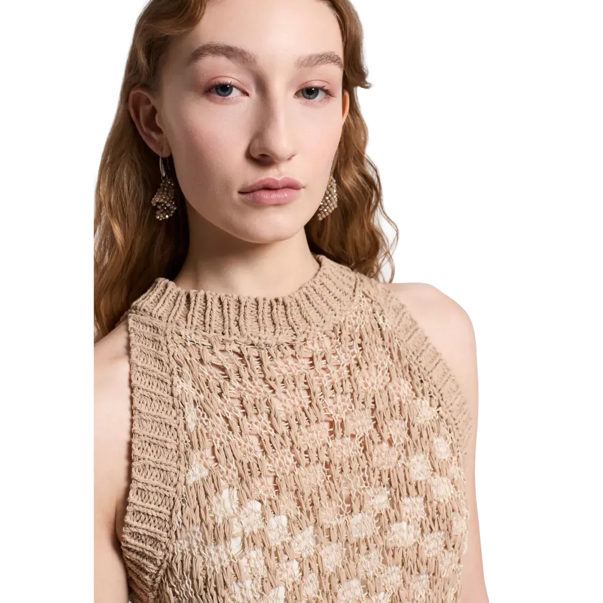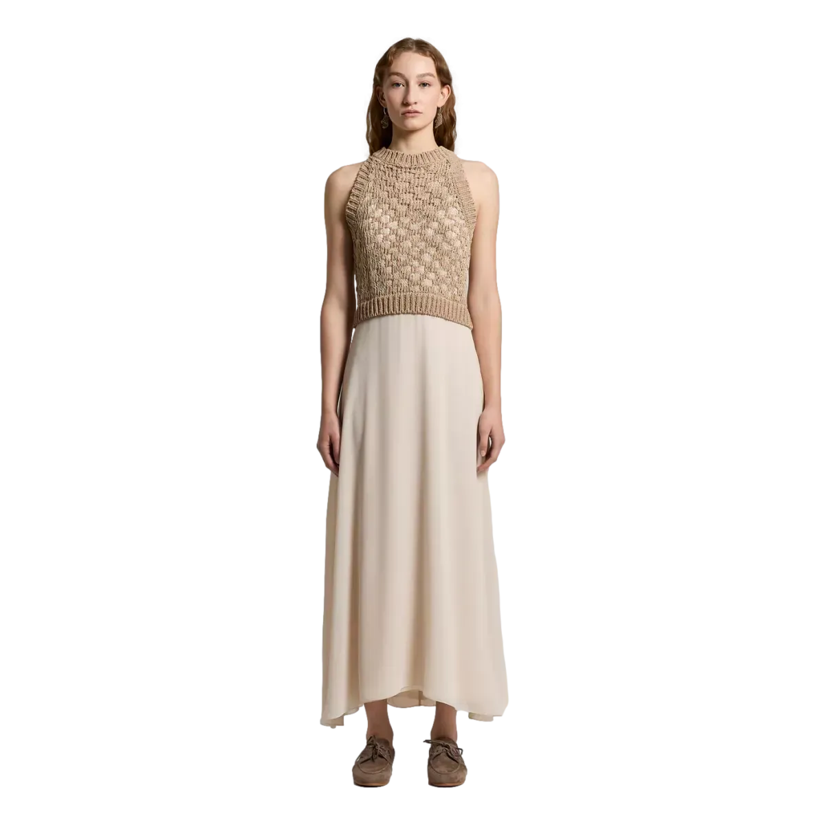 Onder het gebreide lijfje valt een contrasterende lichte crêpe jurk soepel naar beneden, wat zorgt voor een mooi spel tussen structuur en beweging. Deze jurk is moeiteloos te dragen van dag tot avond en is perfect voor wie houdt van tijdloze stijl met een verfijnde uitstraling.