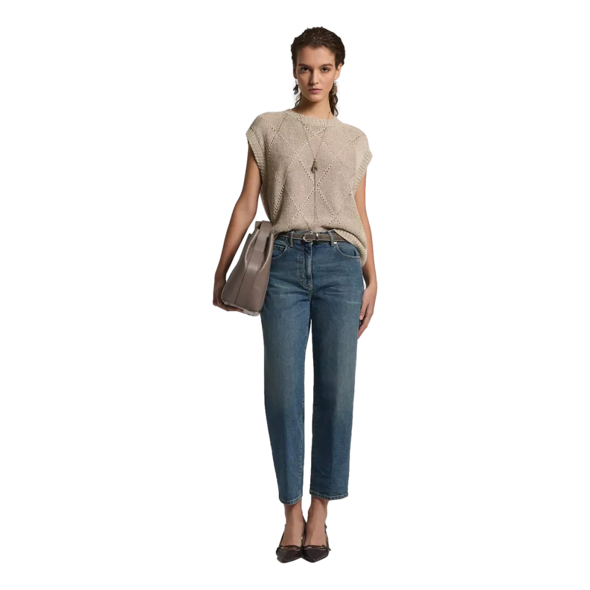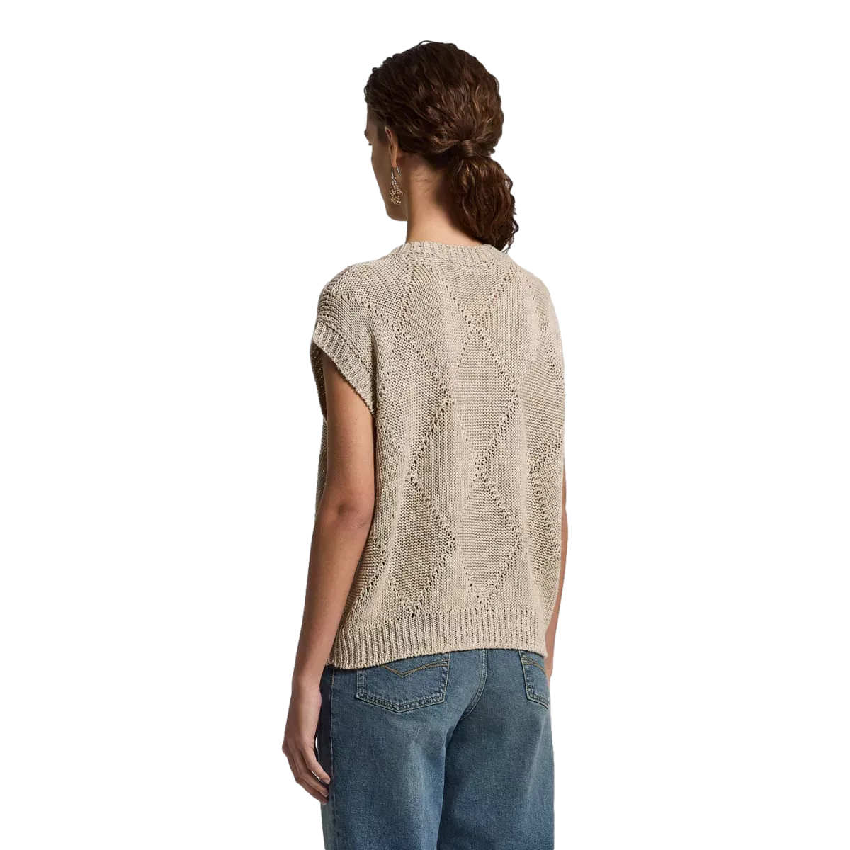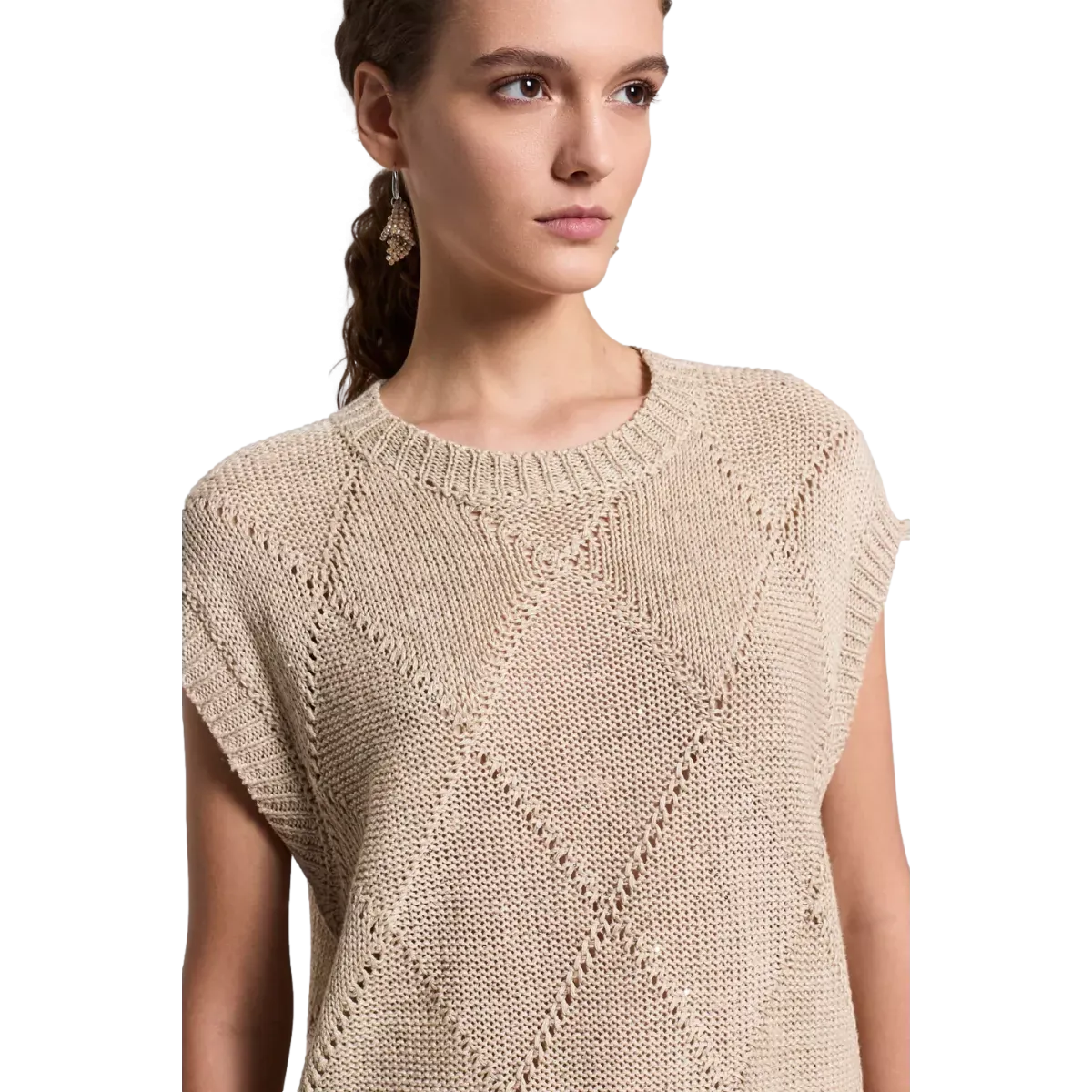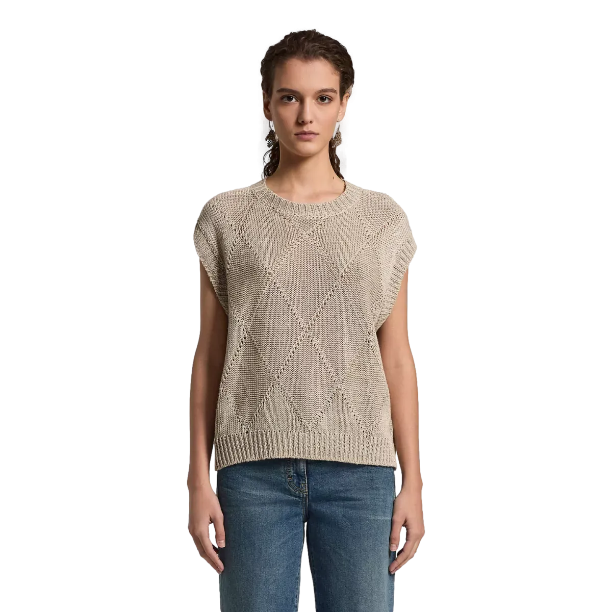 Het ingelegde ruitpatroon met geperforeerde details creëert een uitgesproken, driedimensionale structuur die de natuurlijke melange van het garen prachtig benadrukt. Het spel van open en gesloten vlakken geeft de sweater een grafisch ritme, terwijl de subtiele glans van de pailletten het ontwerp een verfijnde, moderne twist geeft.