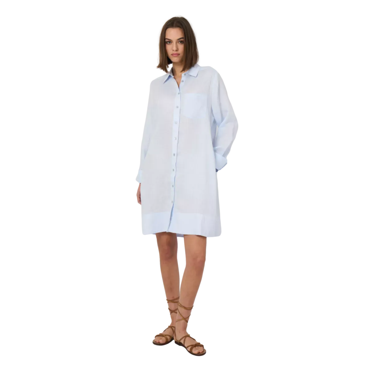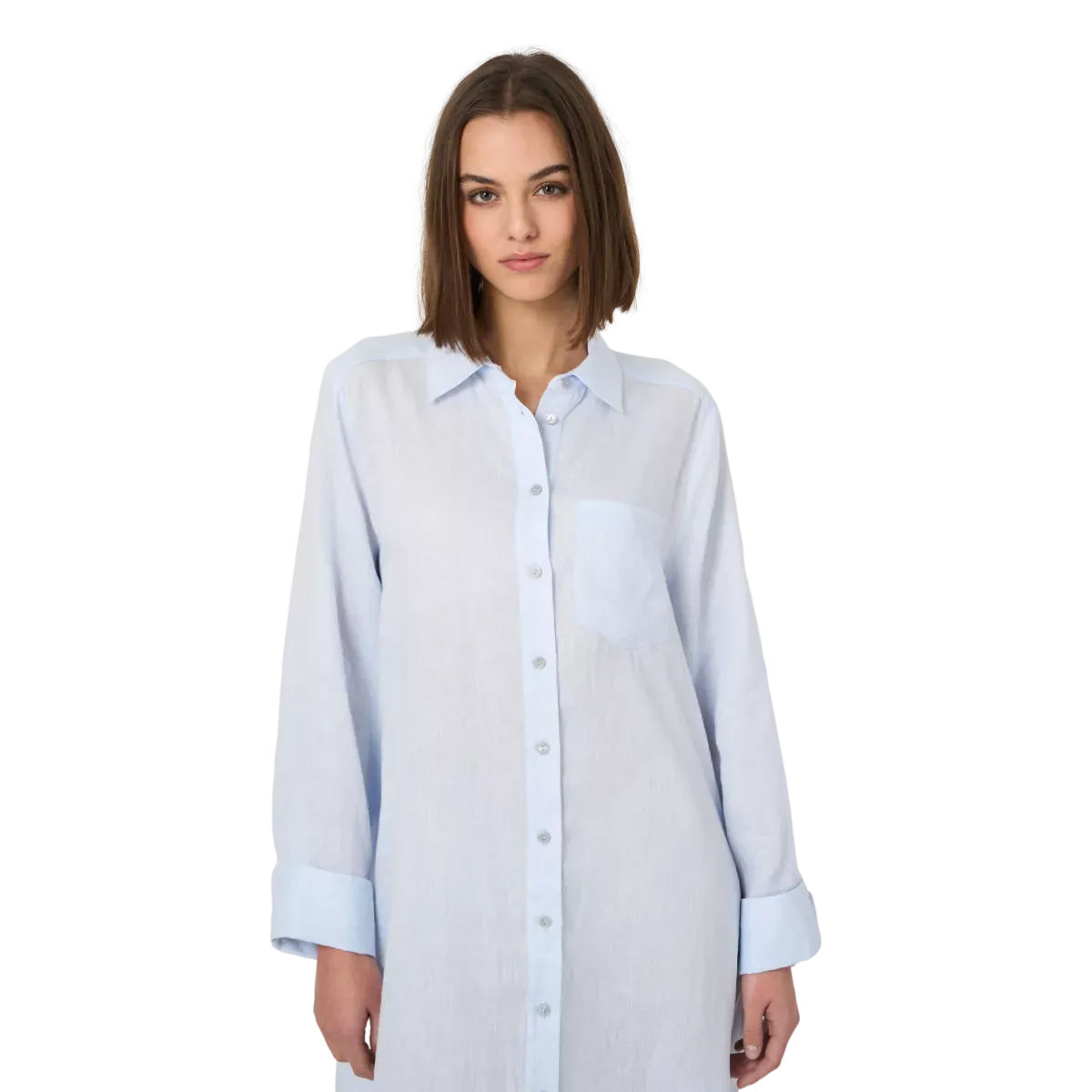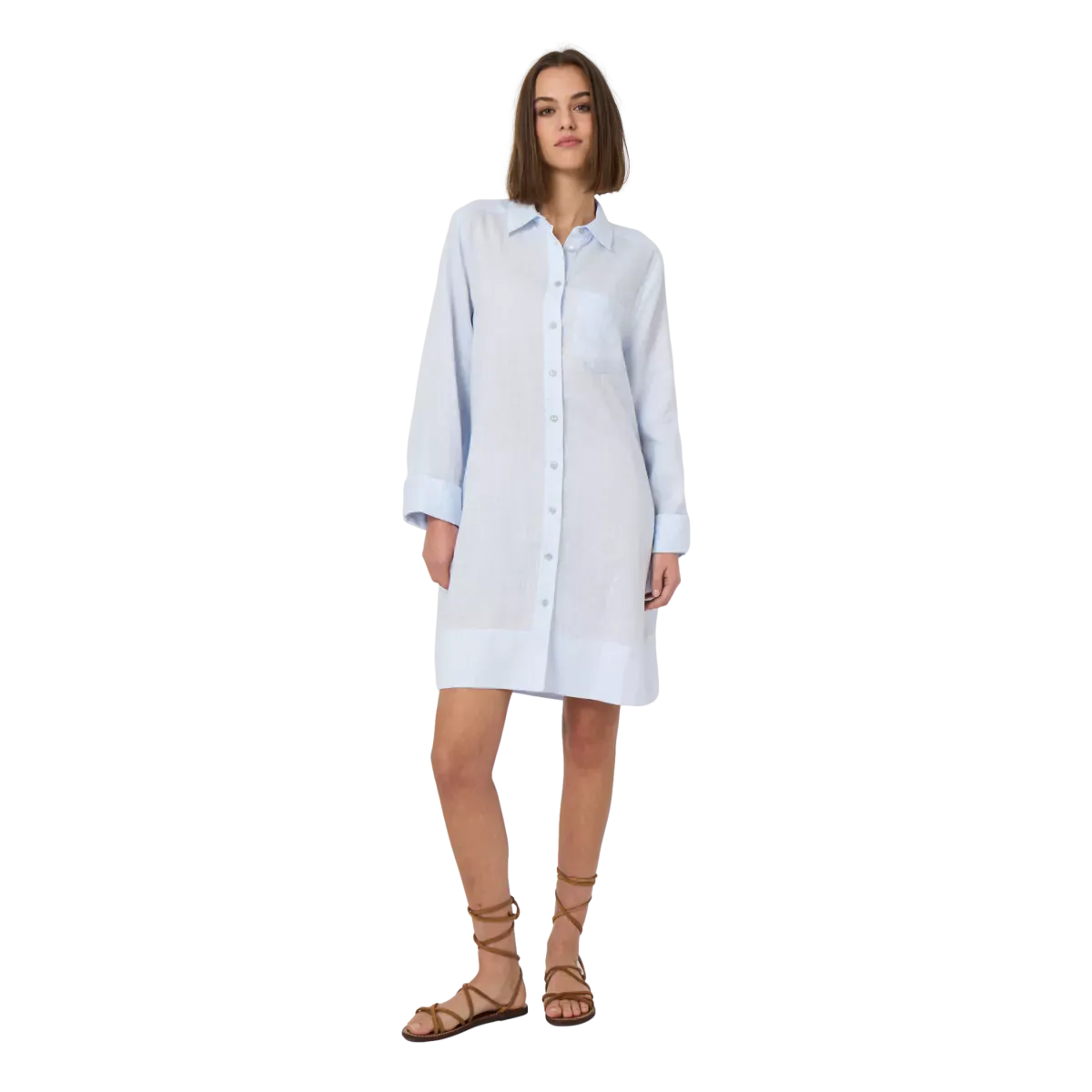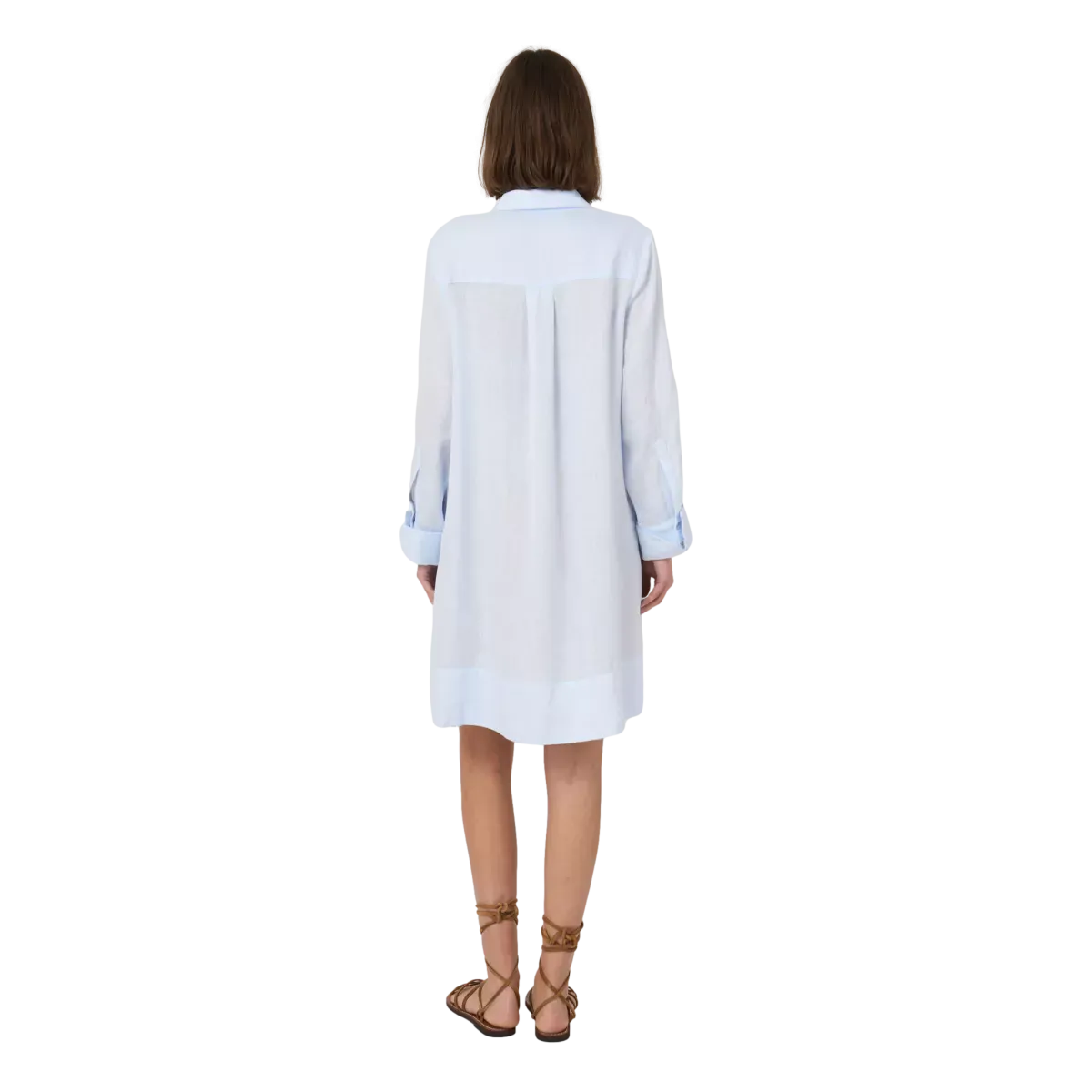 De relaxte A-lijn en normale pasvorm zorgen voor een comfortabele, flatterende look. De jurk is voorzien van een blousekraag, volledige knoopsluiting en een borstzak voor een subtiele, casual touch. De achterpas met stolpplooi geeft extra bewegingsvrijheid, terwijl de afgeronde zoom het silhouet verzacht. De lange mouwen met knoopmanchetten maken het ontwerp veelzijdig en geschikt voor zowel werk als weekend.