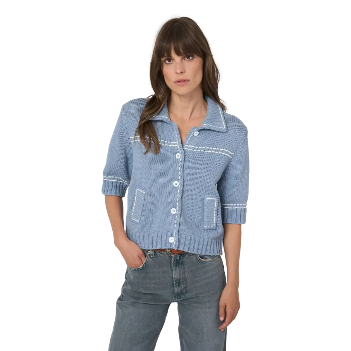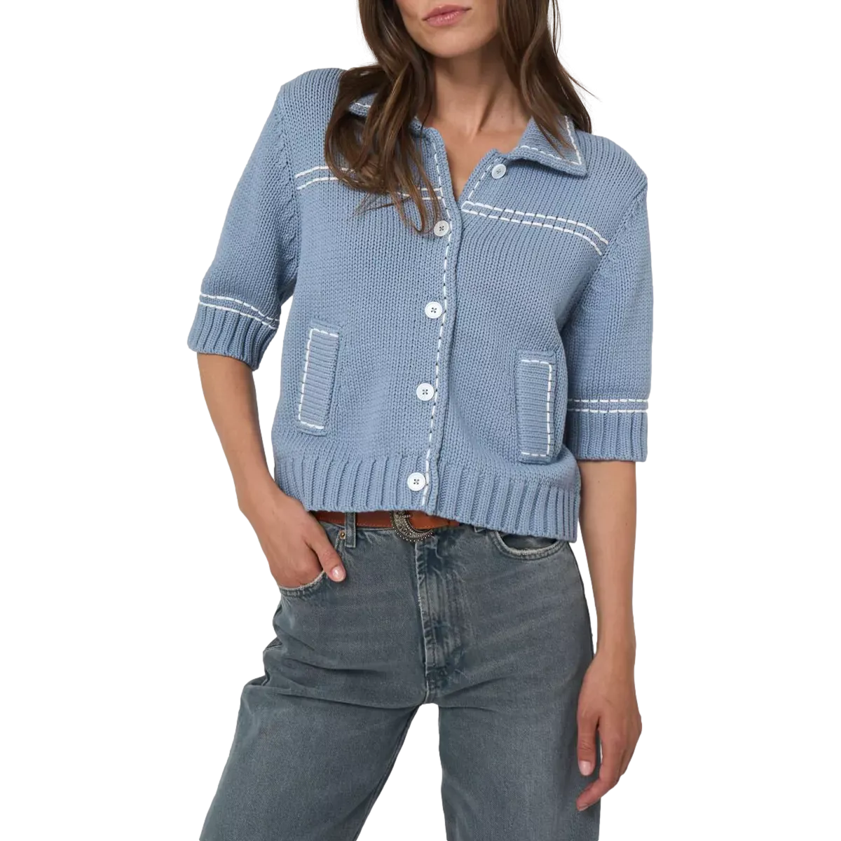 De korte snit met korte mouwen en polohals met knoopsluiting geeft het ontwerp een eigentijdse, verzorgde look die perfect past bij smart-casual outfits. De geribde boorden zorgen voor een prettige pasvorm, terwijl de diagonale zakken en het contrasterende zadelstiksel het vest een verfijnd, grafisch accent geven.