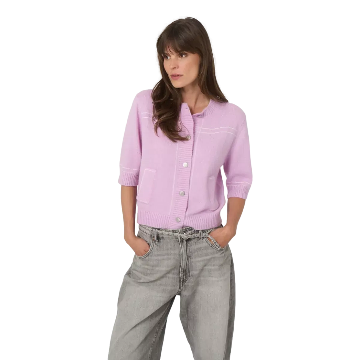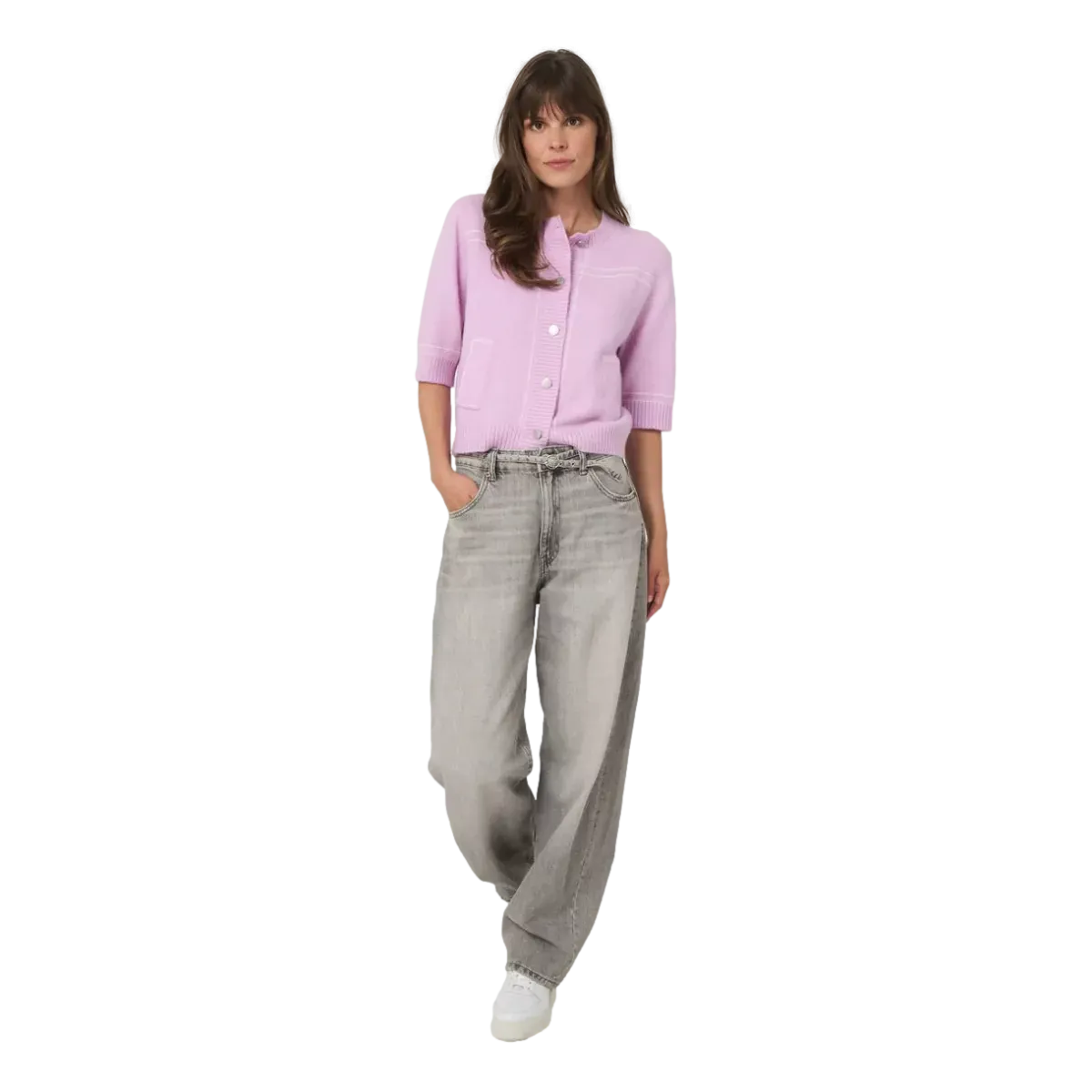 Het boxy cropped silhouet met korte mouwen en een geribde ronde hals geeft het vest een moderne, nonchalante look. De contrasterende stiksels en het decoratieve zadelstiksel voegen subtiele details toe die het ontwerp extra karakter geven. De voorsluiting met REPEAT-logoknopen en decoratieve zakken maken het geheel compleet.
