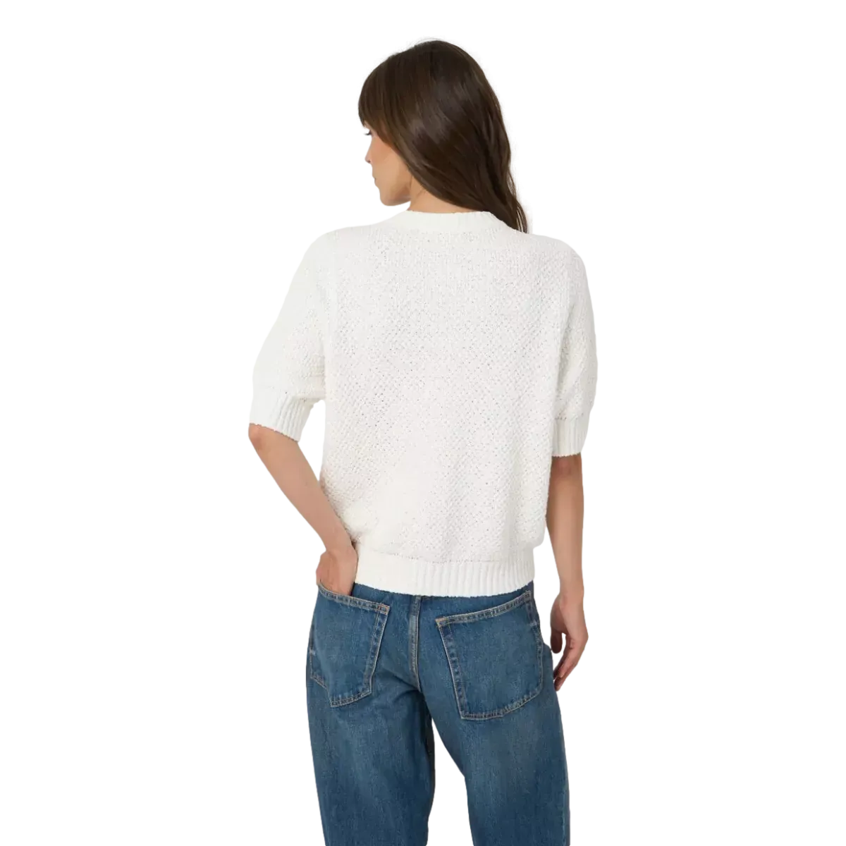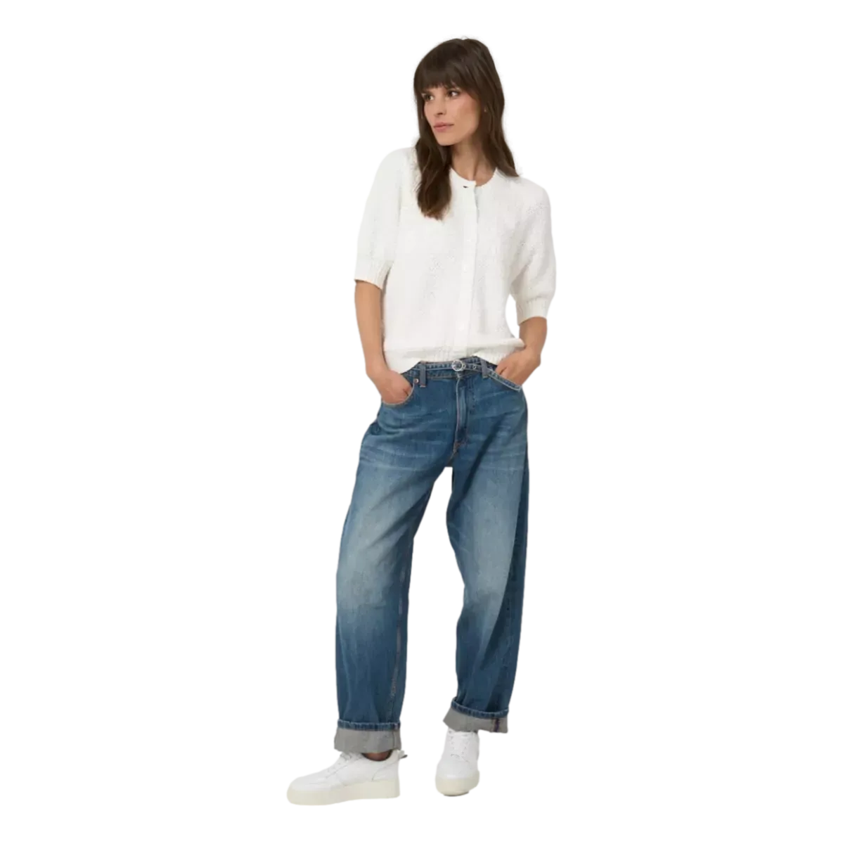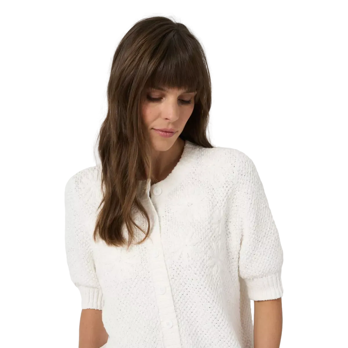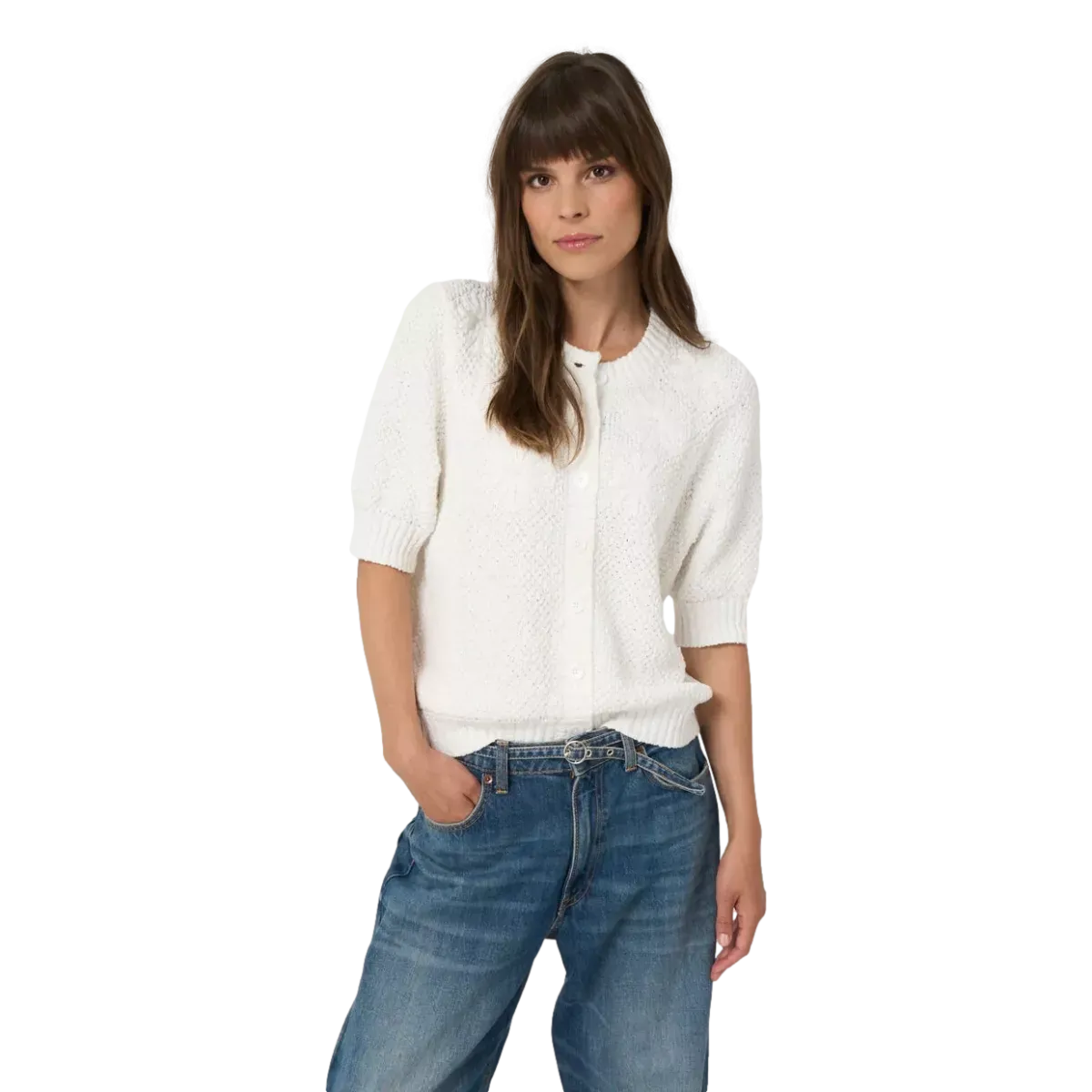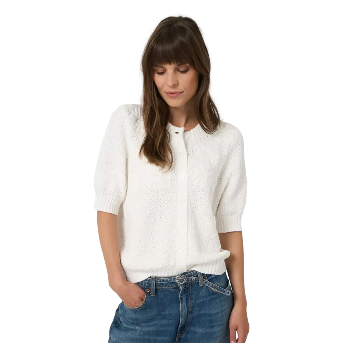 Het korte boxy silhouet met regular fit valt ontspannen en modern. De geribde crew neck, korte geribbelde mouwen en ribboorden zorgen voor een mooie afwerking en extra draagcomfort. Dankzij de knoopsluiting aan de voorkant is het vest veelzijdig te stylen, draag het moeiteloos over een T-shirt of jurk, zowel doordeweeks als in het weekend.