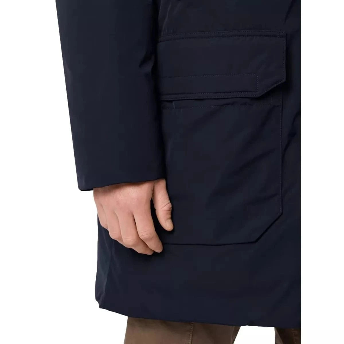 - Opgezette handzakken met klep en verborgen drukknoopsluiting.