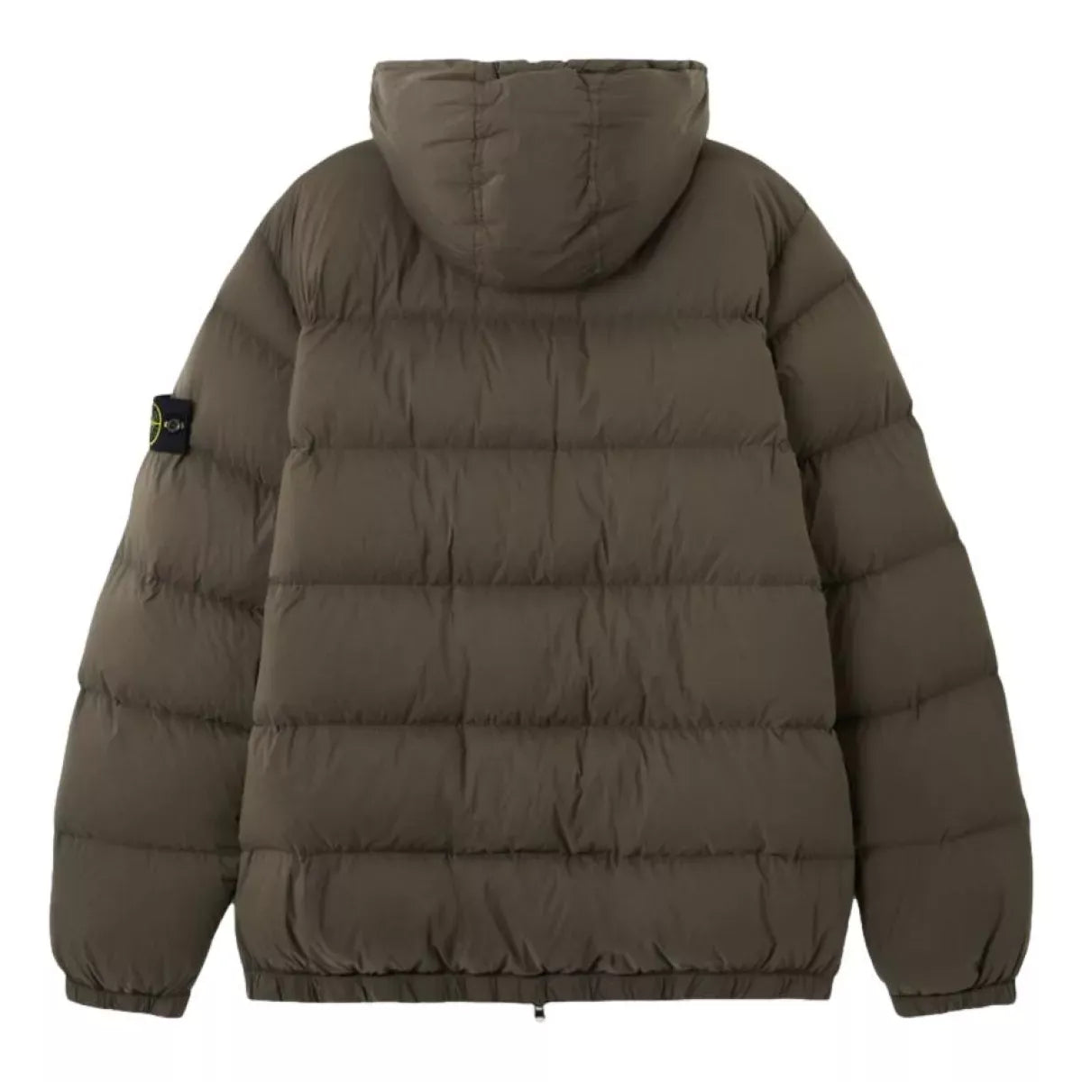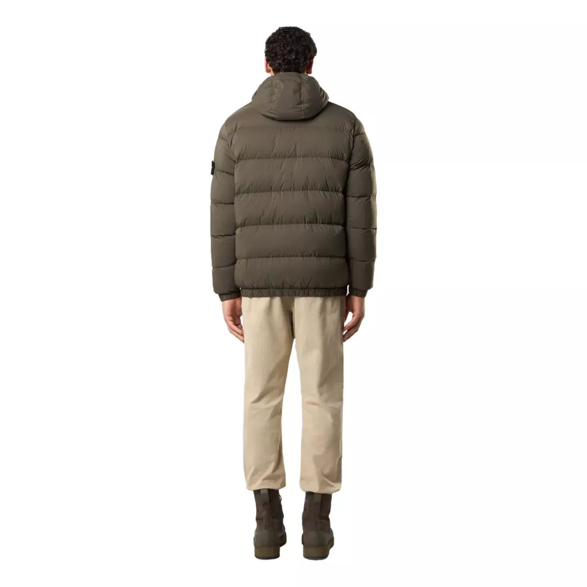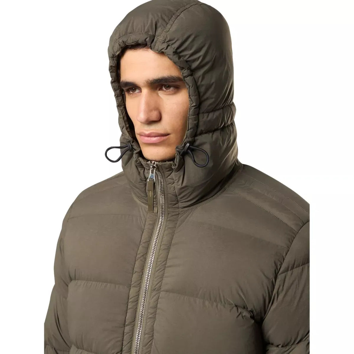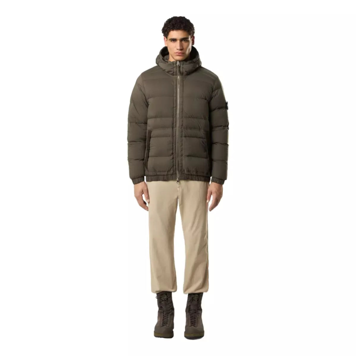 Gewatteerd jack met capuchon van licht stretch nylon in een enkele laag, vervaardigd met een speciale weeftechniek waarbij de compartimenten voor de donsveren direct op het weefgetouw worden gevormd. Dankzij deze naadloze donskamers blijft het dons beter op zijn plaats. Het afgewerkte kledingstuk wordt rechtstreeks gevuld met de fijnste donsveren, die speciaal zijn behandeld om bestand te zijn tegen het kledingverfproces. Het jack is stukgeverfd met toevoeging van een speciale waterafstotende coating. Gecertificeerd volgens de RDS (Responsible Down Standard).