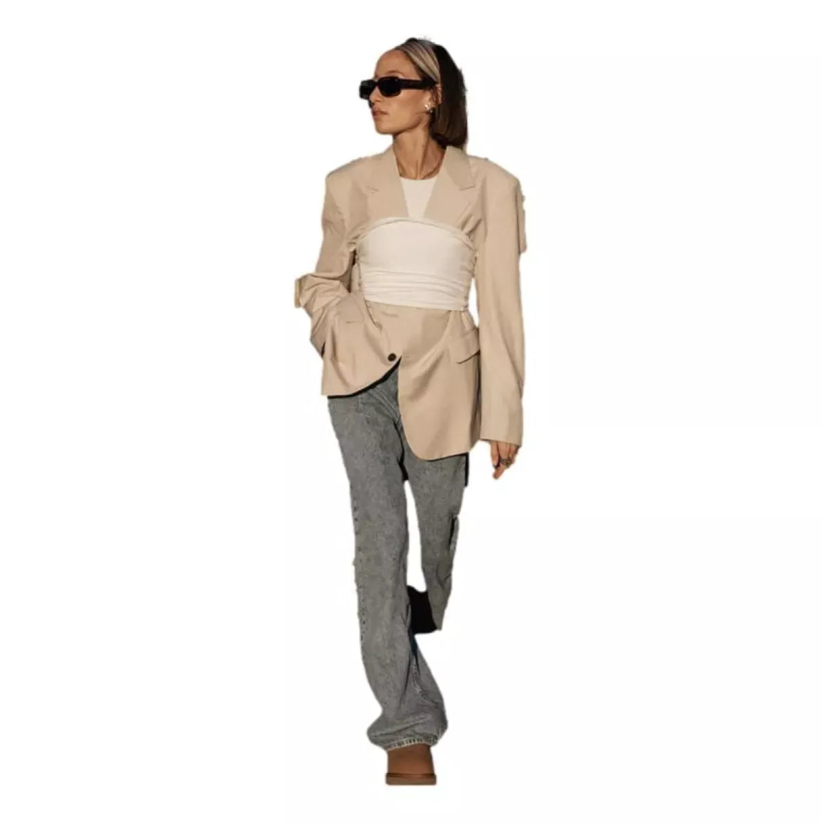 - Asymmetrische bovenrand, overlockstiksels op de naden, treklus aan de achterkant, suède hielkap