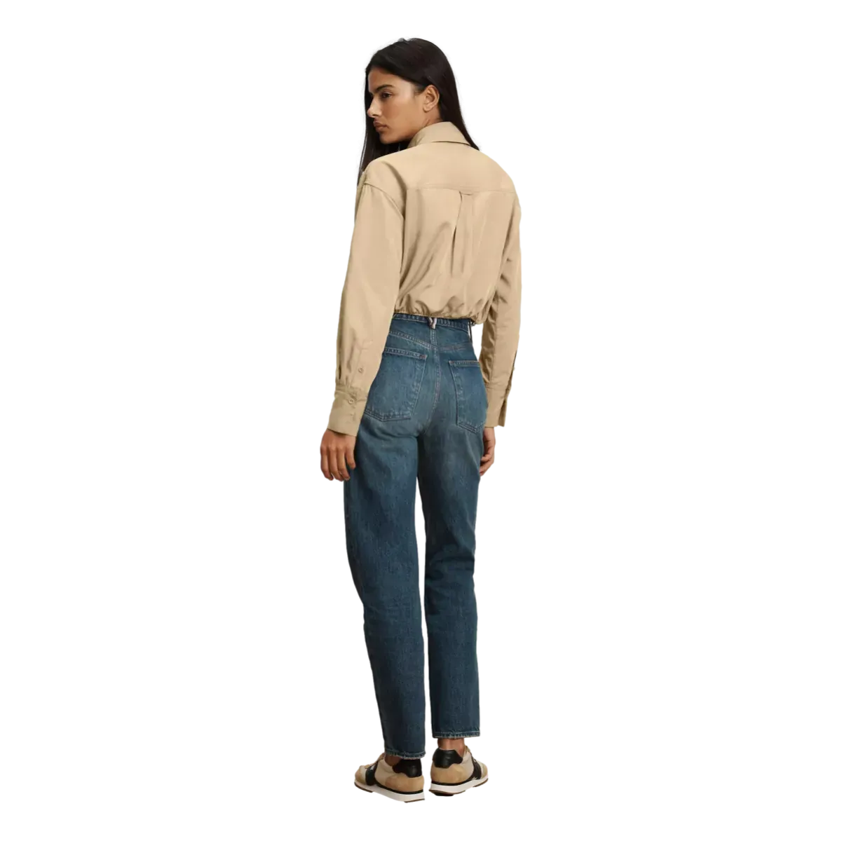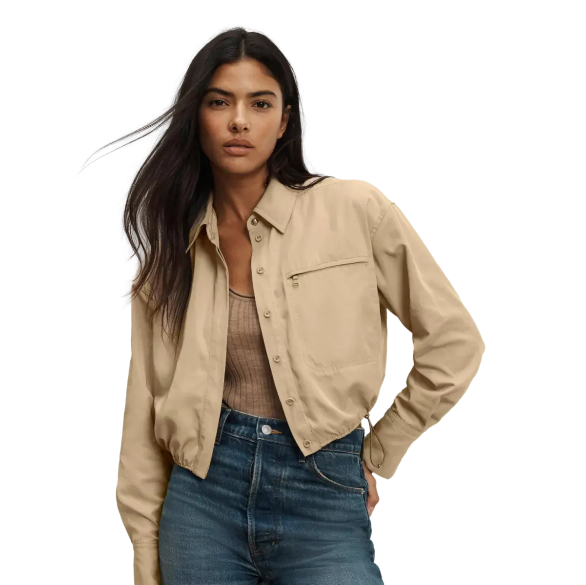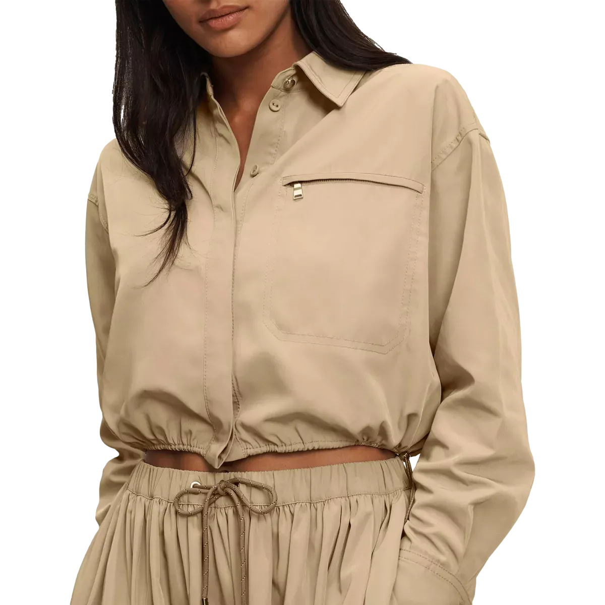 Het shirt heeft een relaxed fit met een licht cropped silhouet, waardoor het moeiteloos modern oogt. Dankzij het verstelbare bungee-trekkoord in de taille bepaal je zelf de vorm: los voor een nonchalante look of aangesnoerd voor extra definitie. De verborgen knoopsluiting wordt subtiel geaccentueerd door één metalen statement-knoop, terwijl de oversized ritszak een stoer, functioneel element toevoegt.